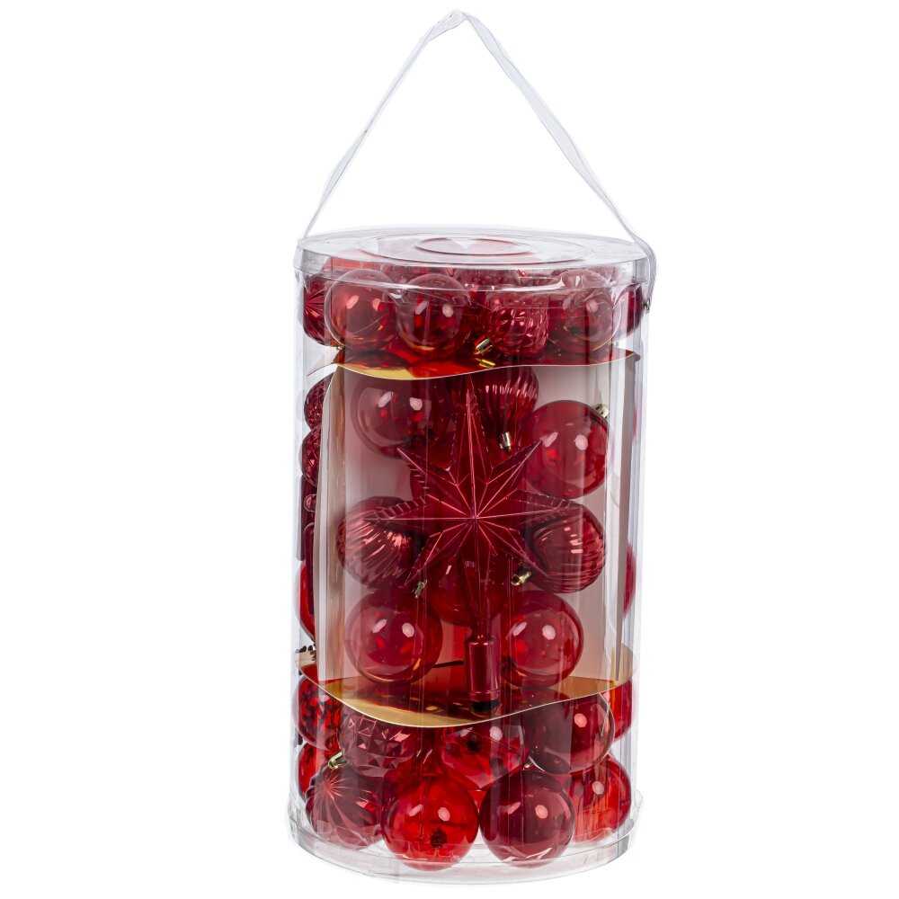Набор из 56шт украшение новогоднее шар, l21 w21 h37 см. Материал: Полимерные материалы Большой новогодний набор украшений в ярко-красных оттенках включает 56 элементов, в том числе верхушку на елку в виде Вифлеемской звезды. В комплекте разнообразные шары, сосульки и снежинки различной фактуры и диаметра. В набор входит: Верхушка елочная (13х18,5 см) - 1 шт; Шар (D4 см) - 16 шт; Шар (D5 см) - 26 шт; Шар (D8 см) - 4 шт; Шар (D10 см) - 2шт; Сосулька фигурная (H14 см) - 2 шт; Сосулька (Н18,5 см) - 3 шт; Снежинка (D12 см) - 2 шт. Вес, кг: 0. 6