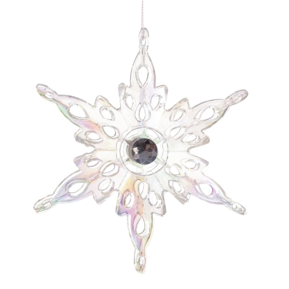 Украшение новогоднее снежинка, l13 w3 h15 см. Материал: Полимерные материалы Новогоднее украшение Снежинка выполнено из прозрачного полиакрила с легким жемчужным переливом, что придает ему особую изящность. Объемная форма снежинки делает ее заметной деталью вашего праздничного декора. Это украшение прекрасно подходит как для оформления елки, так и для декорирования окон, создавая волшебную атмосферу зимнего праздника. Эффект отражения света добавляет праздничного настроения, а разнообразие вариантов размещения позволяет вам проявить креативность. Вес, кг: 0. 028