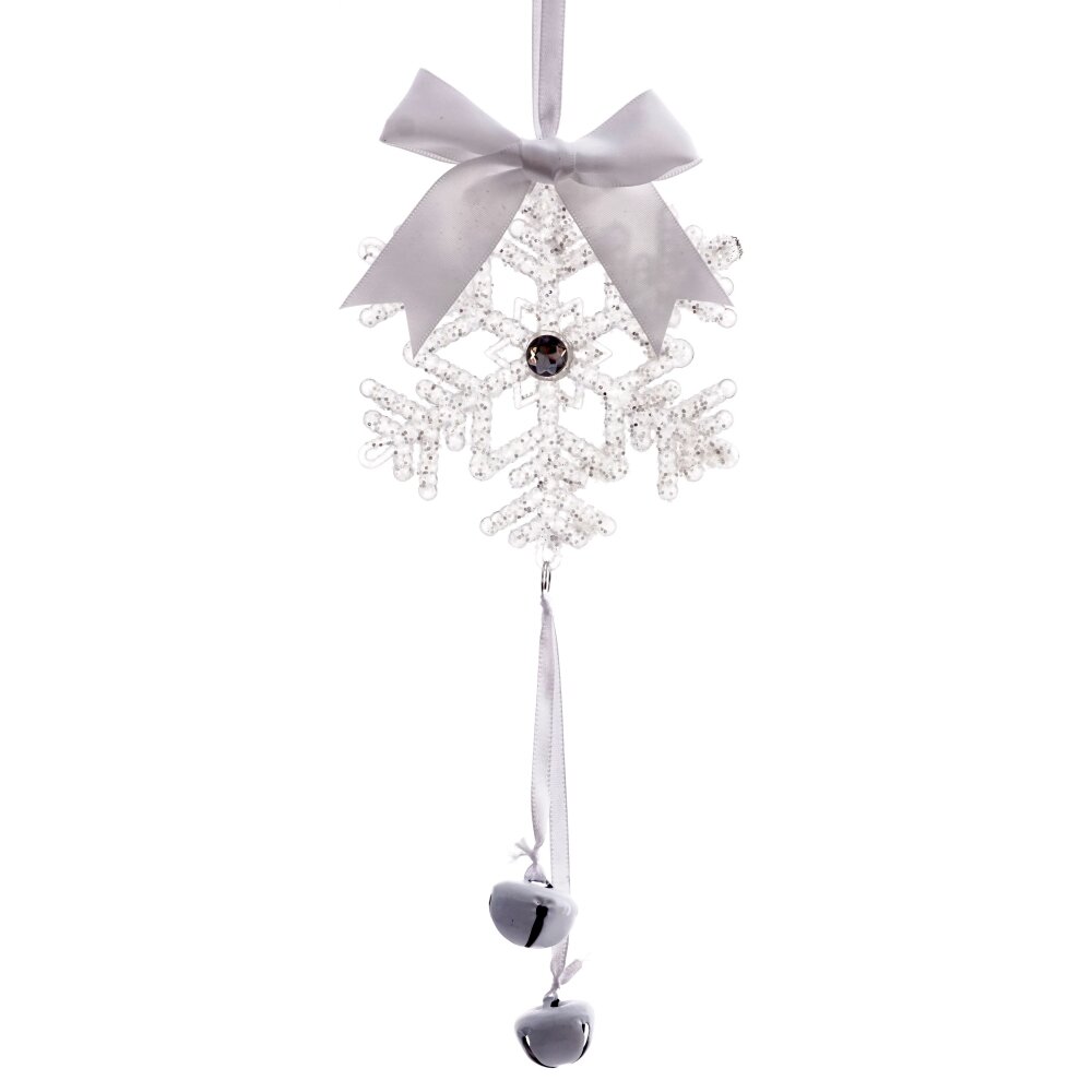 Украшение новогоднее снежинка, l10,5 w3 h27 см. Материал: Полимерные материалы/Металл Новогоднее украшение Снежинка — это потрясающий элемент декора, созданный из полимерных материалов. Снежинка, покрытая сверкающим снежным глиттером, излучает праздничный свет и элегантность. Нежная ленточка с бантом служит украшением, добавляя изысканности. Особую прелесть придают милые бубенчики на длинной подвеске. Это украшение станет великолепным акцентом на новогодней елке или в праздничном интерьере, создавая атмосферу зимнего волшебства и тепла. Вес, кг: 0. 042
