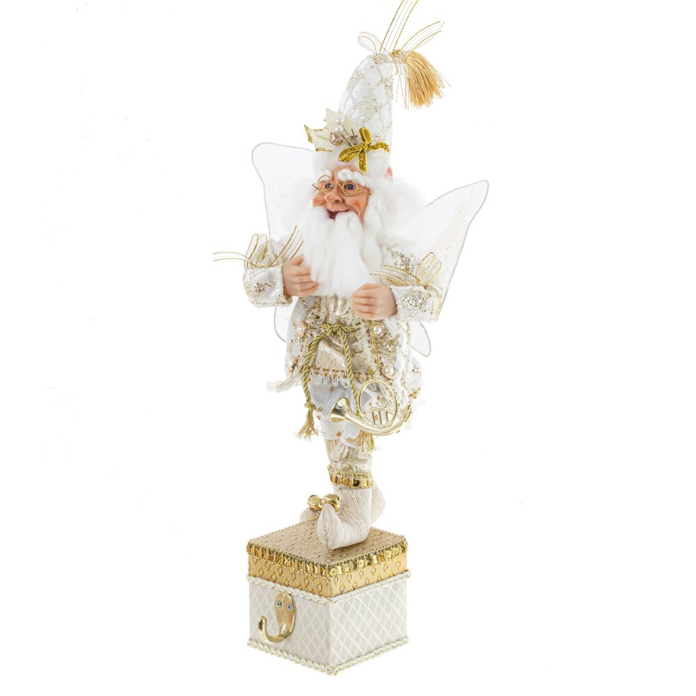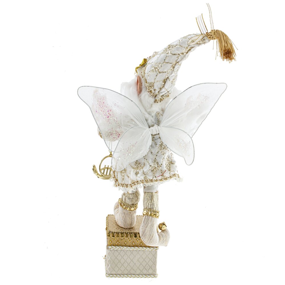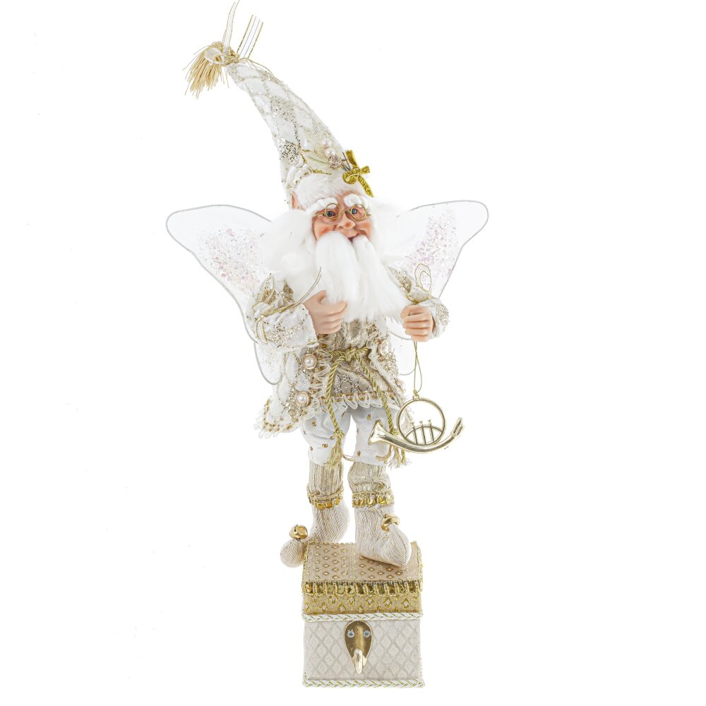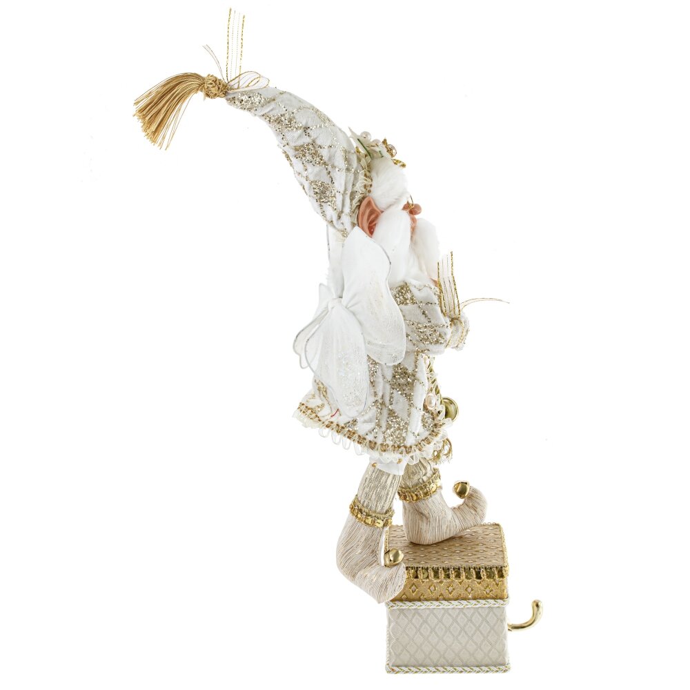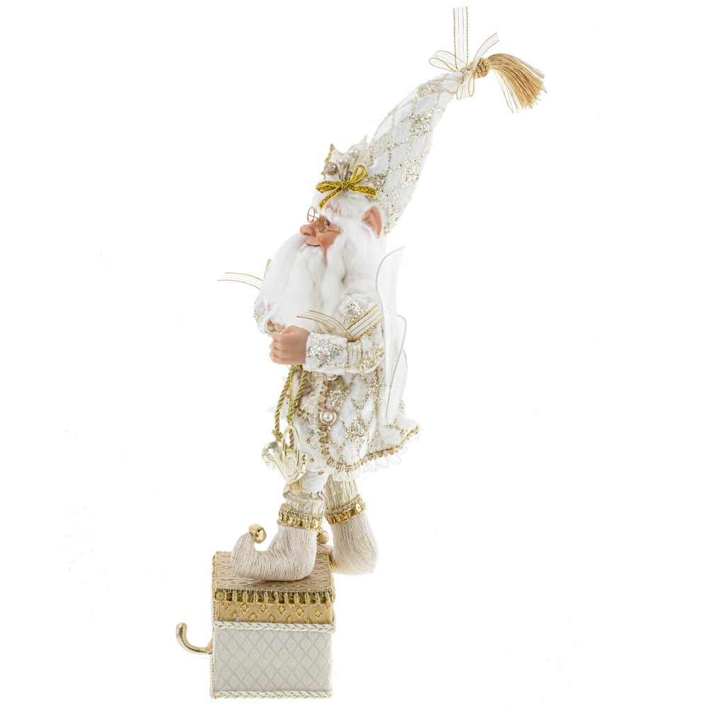 Дед мороз, l18 w16 h58/36 см. Материал: Полимерные материалы/Текстиль/Дерево Декоративная игрушка Дед Мороз-эльф - прекрасное дополнение к новогоднему интерьеру. Этот персонаж выглядит как эльф с крылышками внарядном бело-золотом костюме с колпаком, стоящий на золотой подставке с крючком для подвешивания носка. Реалистичные лицо и руки, выполненные из полимерных материалов, придают особый шарм этой игрушке. Он наполняет пространство таинственным и праздничным настроением. Вес, кг: 0. 908