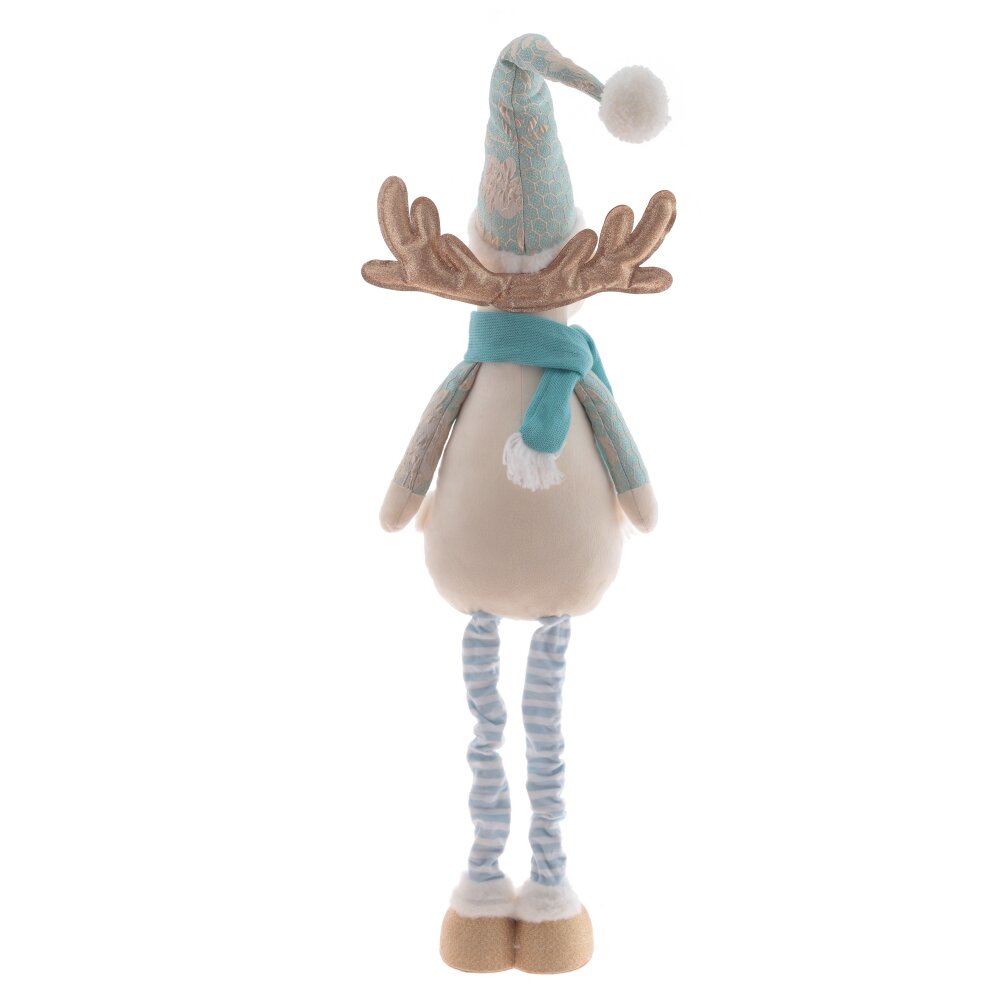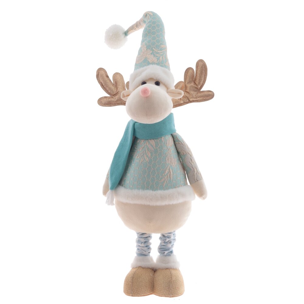 Эта интерьерная игрушка высотой от 51 до 100 см представляет собой белого оленя с золотыми рогами, одетого в красивый голубой зимний наряд. Длинный колпак с проволокой внутри позволяет придавать ему разные формы, добавляя оленю еще большую живость. Телескопические ножки позволяют изменять высоту игрушки и гармонично вписать ее в любой интерьер. Золотые копыта гармонично сочетаются с золотыми рогами и рисунком на одежде, а голубой шарф дополняет образ и придает оленю особый шарм.