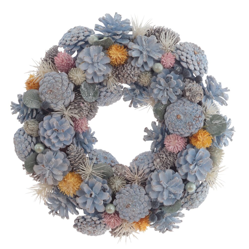 Изделие декоративное венок, l34 w8 h34 см. Материал: Полимерные материалы/Натуральные материалы Этот великолепный венок диаметром 34 см из шишек и сухоцветов привнесет в ваш интерьер атмосферу зимней сказки. Светло-голубая цветовая гамма создает впечатление морозной красоты, напоминая о холодных, сверкающих снежинках и ясном зимнем небе. Венок удивительно гармонично соединяет натуральные материалы, что делает его не только стильным, но и экологически чистым декором. Он легко впишется в любой интерьер — от классического до современного, добавляя нотки изысканности и оригинальности. Вес, кг: 0. 667