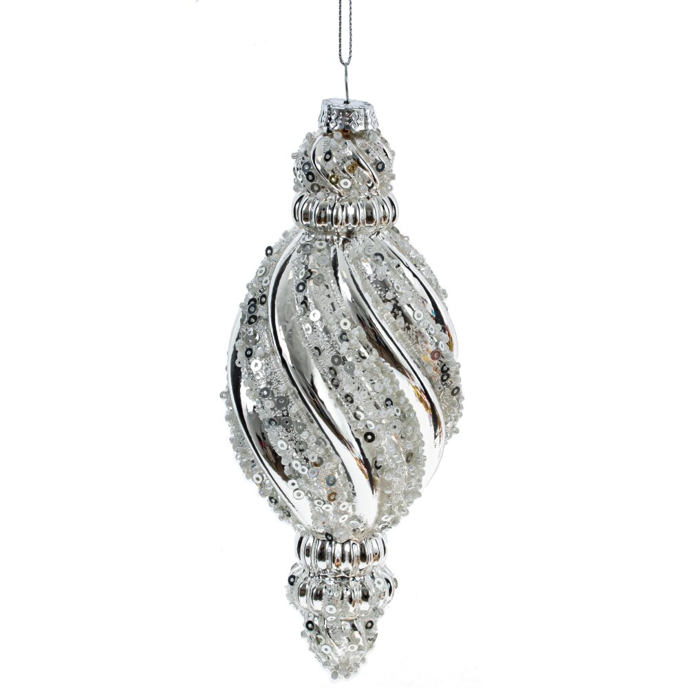 Украшение новогоднее фигурная сосулька, l7 w7 h18 см. Материал: Стекло Елочное украшение в виде серебряной фигурной сосульки - это настоящее произведение искусства. Его вытянутая симметричная форма, слегка закрученная по спирали, придает изысканность и оригинальность. Украшение, выполненное из стекла, дополнительно украшено бисером и пайетками, что создает эффект мерцания и блеска. Серебряный колпачок с петелькой и ниточкой для подвешивания делает его практичным и удобным в использовании. Такое украшение станет изысканным акцентом на новогодней елке. Вес, кг: 0. 065