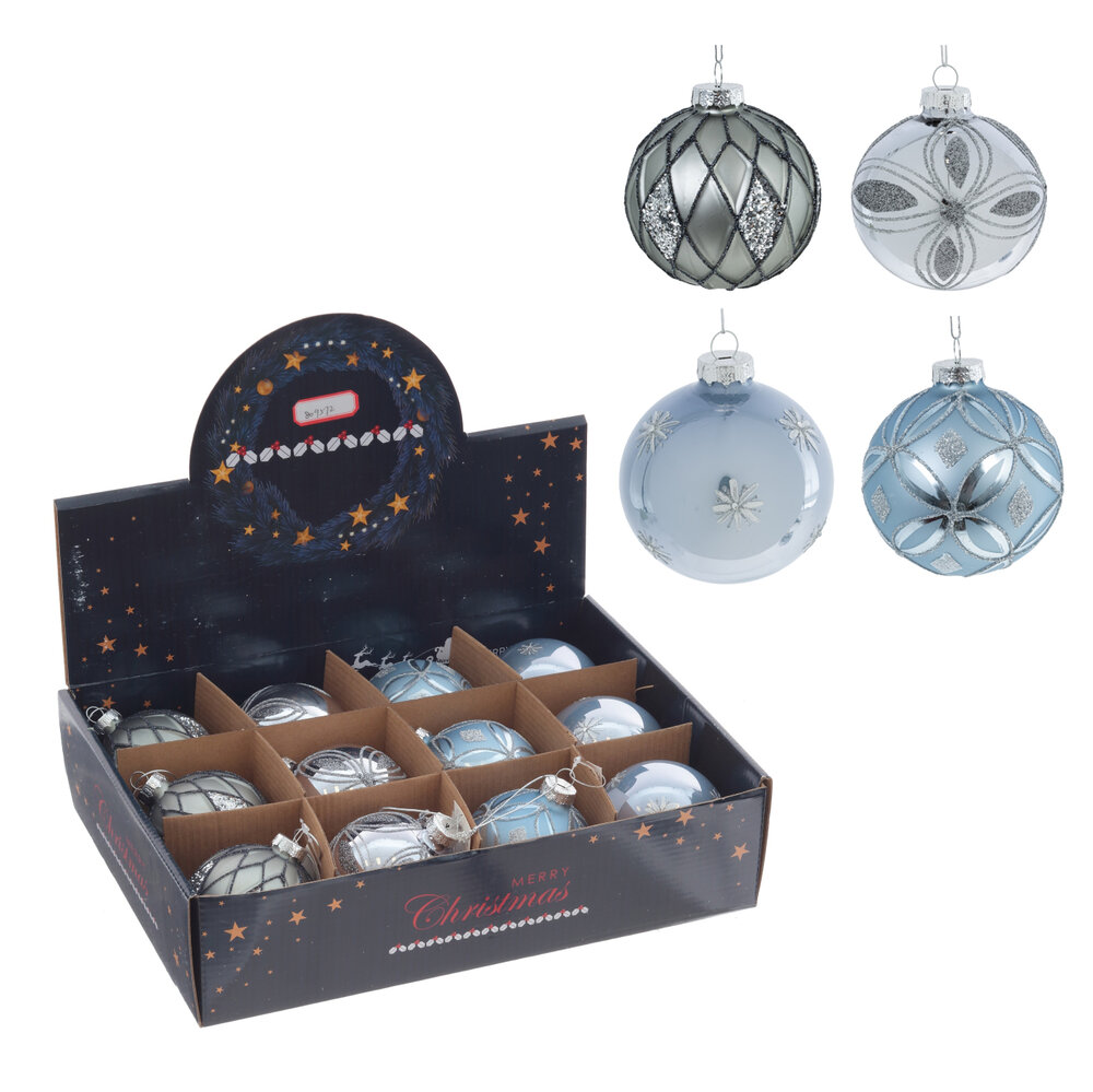 Набор из 12шт украшение новогоднее шар, d 8 см, l34 w25 h8 см. Материал: Стекло Набор из двенадцати стеклянных елочных шаров в серых и голубых оттенках, украшенных рисунками из серебристого глиттера. В комплекте представлены четыре вида шаров, по три каждого. Этот набор поможет вам создать стильную и гармоничную новогоднюю атмосферу в вашем доме. Шары отлично будут смотреться как на классической елочке, так и на современном декоре, добавляя изящности и блеска праздничному интерьеру. Вес, кг: 0. 337