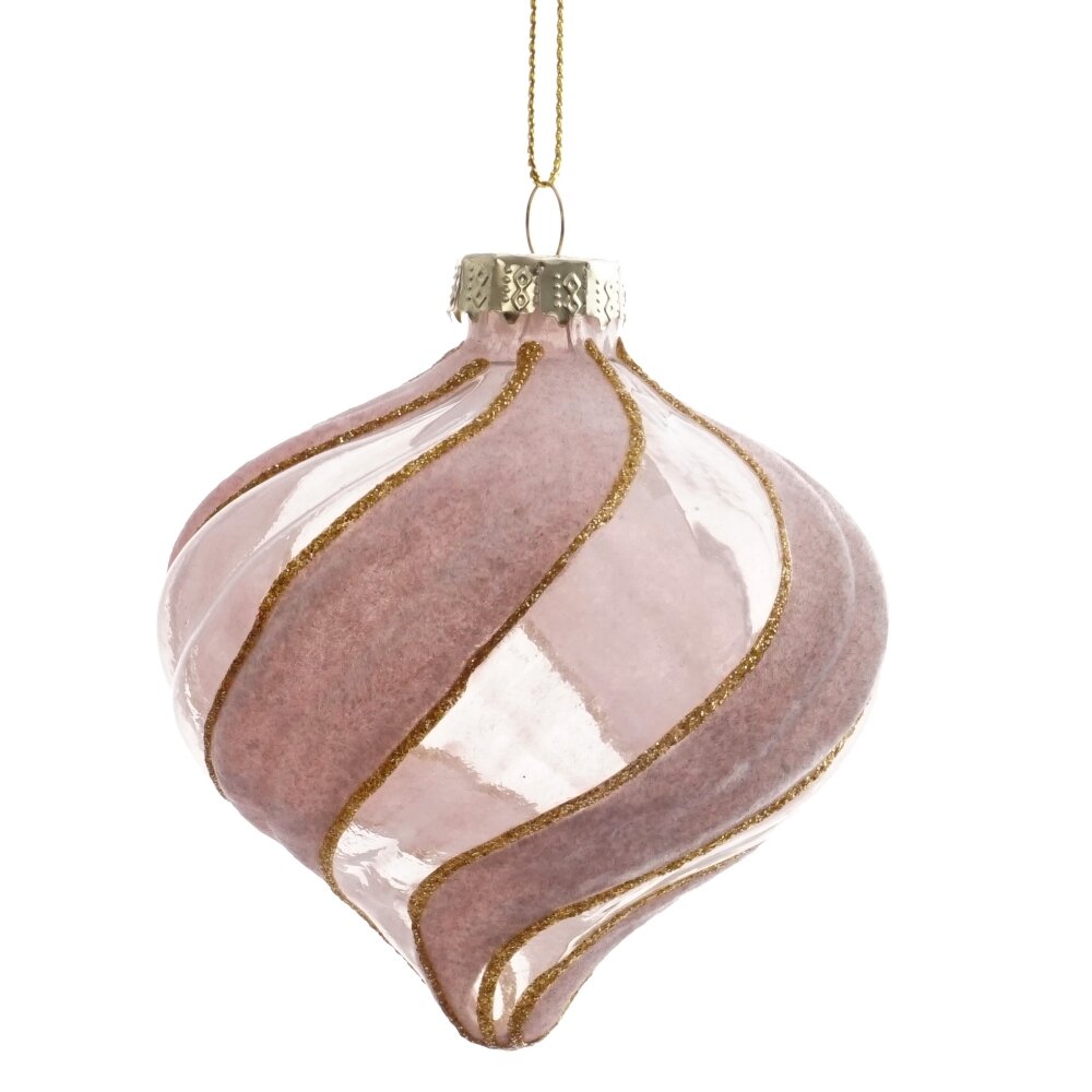 Украшение новогоднее капля, l10 w10 h12 см. Материал: Стекло Элегантное елочное украшение из стекла представляет собой каплю-луковку, где розовая прозрачная линия переплетается с бархатной, образуя красивую спираль, разделенную тонкими золотыми полосками. На вершине украшения расположен золотой колпачек с петелькой и нитью для подвеса, что позволяет легко добавить его к украшению елочной ветки, придавая праздничное настроение и изысканный вид вашему интерьеру. Вес, кг: 0. 029