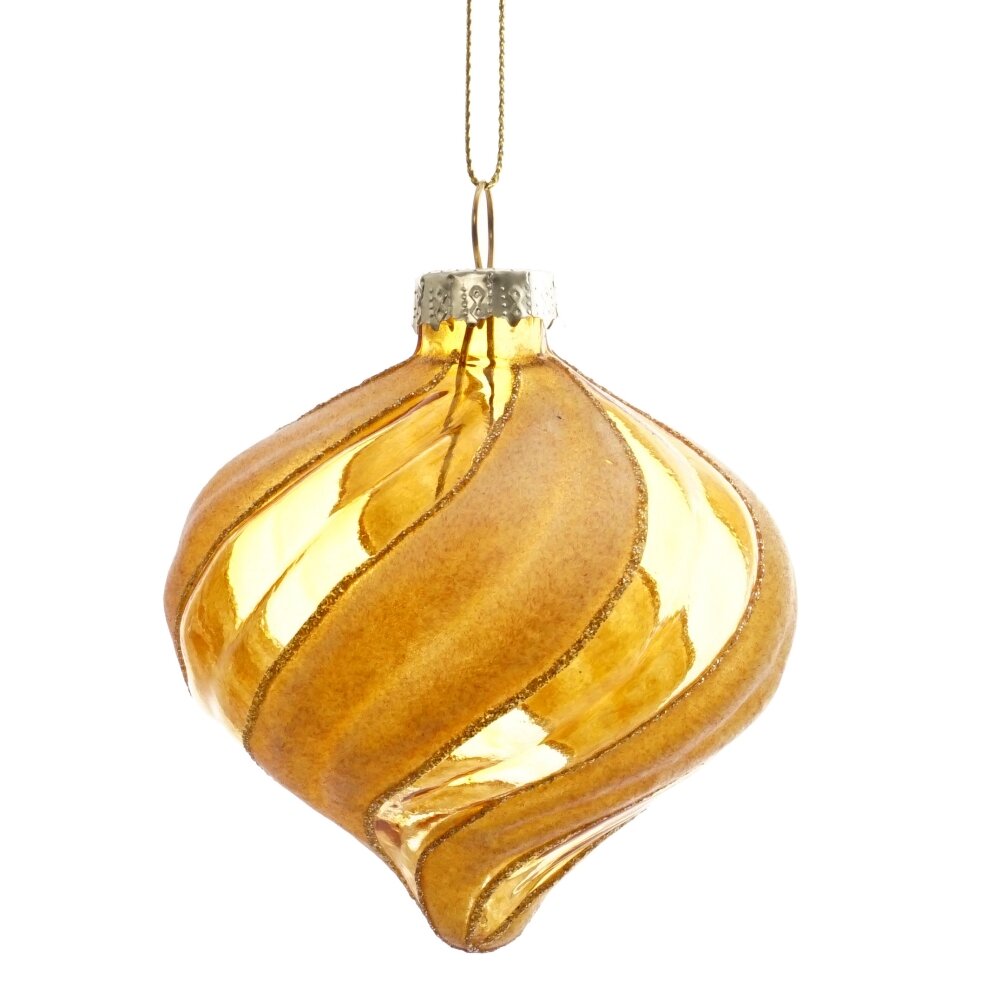 Украшение новогоднее капля, l8 w8 h9 см. Материал: Стекло Элегантное елочное украшение из стекла представляет собой каплю-луковку, где желтая прозрачная линия переплетается с бархатной, образуя красивую спираль, разделенную тонкими золотыми полосками. На вершине украшения расположен золотой колпачек с петелькой и нитью для подвеса, что позволяет легко добавить его к украшению елочной ветки, придавая праздничное настроение и изысканный вид вашему интерьеру. Вес, кг: 0. 027