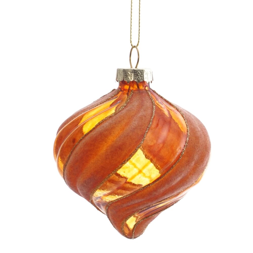 Украшение новогоднее капля, l8 w8 h9 см. Материал: Стекло Элегантное елочное украшение из стекла представляет собой каплю-луковку, где оранжевая прозрачная линия переплетается с бархатной, образуя красивую спираль, разделенную тонкими золотыми полосками. На вершине украшения расположен золотой колпачек с петелькой и нитью для подвеса, что позволяет легко добавить его к украшению елочной ветки, придавая праздничное настроение и изысканный вид вашему интерьеру. Вес, кг: 0. 027