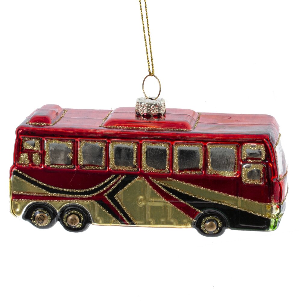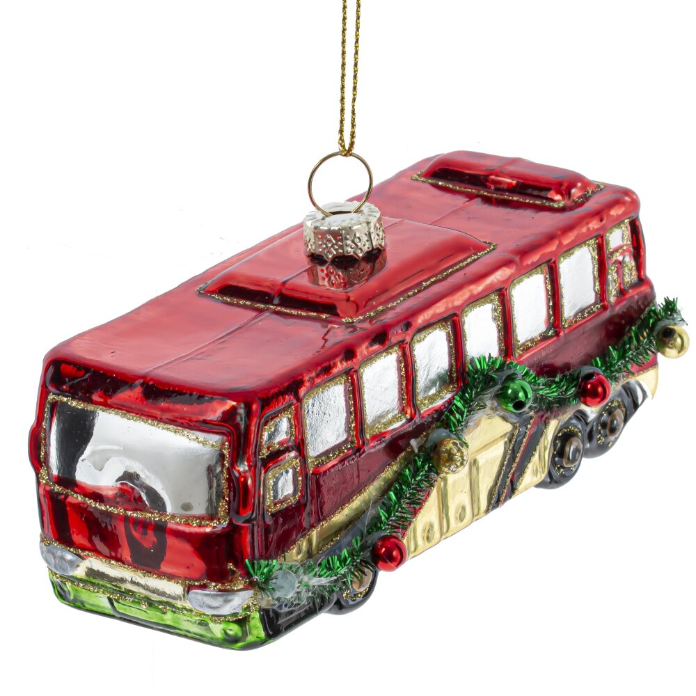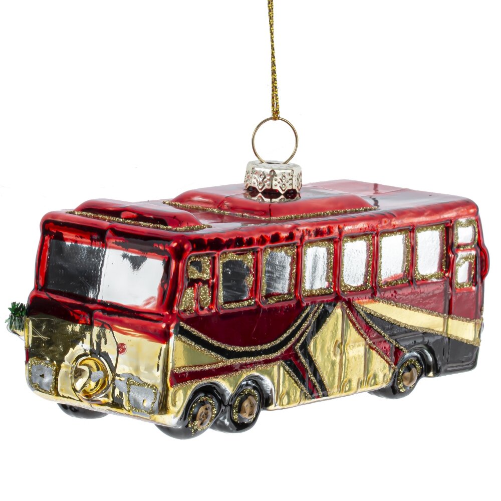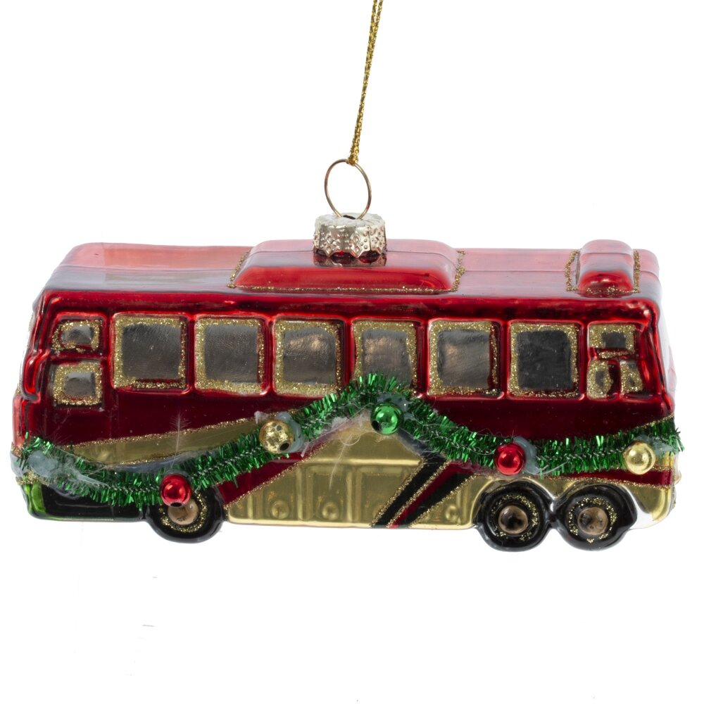 Украшение новогоднее автобус, l12 w5,5 h7 см. Материал: Стекло Яркое и атмосферное новогоднее украшение из стекла в виде красного автобуса, украшенного праздничной гирляндой, добавит оригинальности и уюта в ваш праздничный декор. Детально проработанный автобус с блестящими окнами, колёсами и гирляндой выглядит как сказочный транспорт, мчащийся навстречу новогоднему чуду. Выполненное из тонкого стекла с ручной росписью и блестящими акцентами, украшение переливается в свете гирлянд, создавая тёплое и радостное настроение. Такое украшение станет эффектным элементом на ёлке, особенно в интерьерах с винтажными или креативными акцентами, и порадует как взрослых, так и детей. Прекрасный вариант для подарка или коллекции необычных ёлочных игрушек. Вес, кг: 0. 049