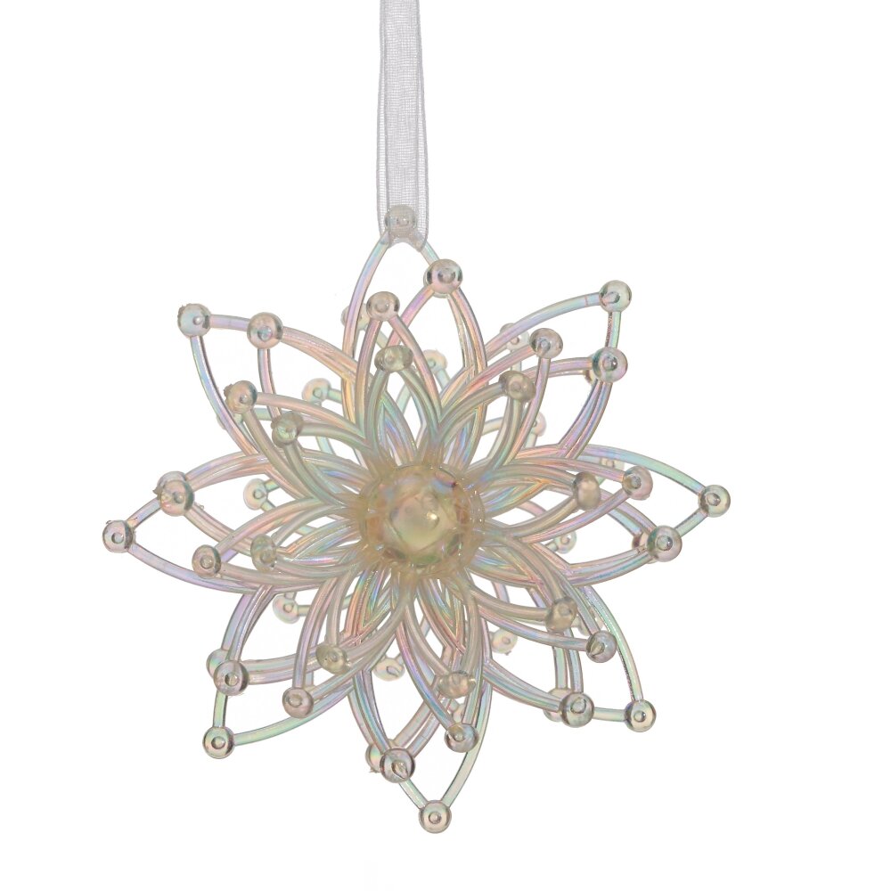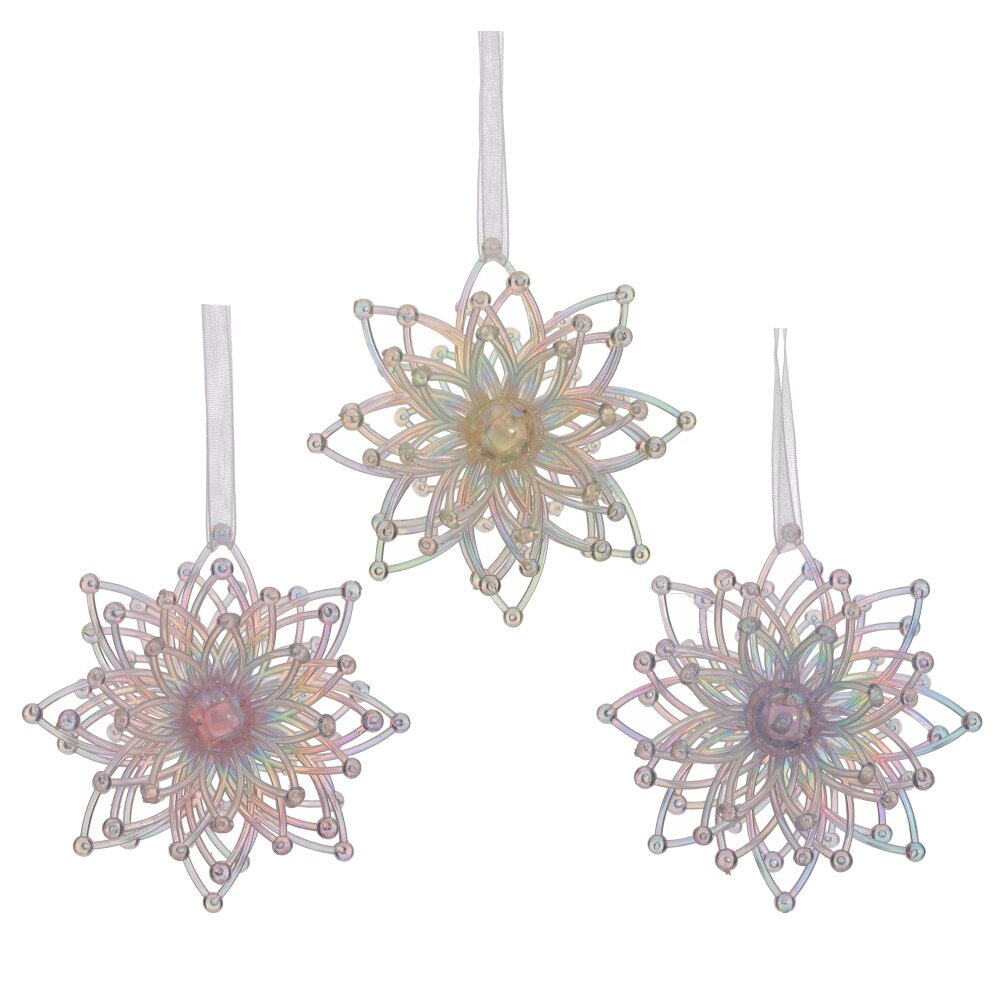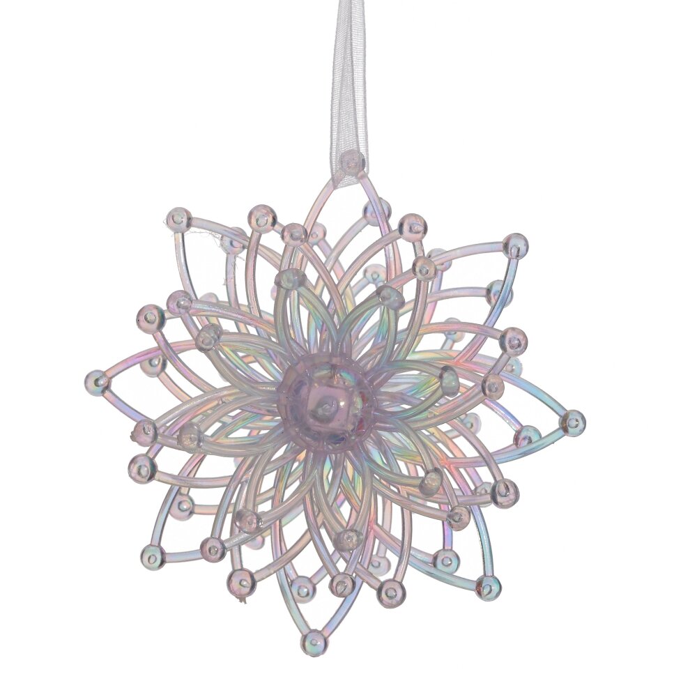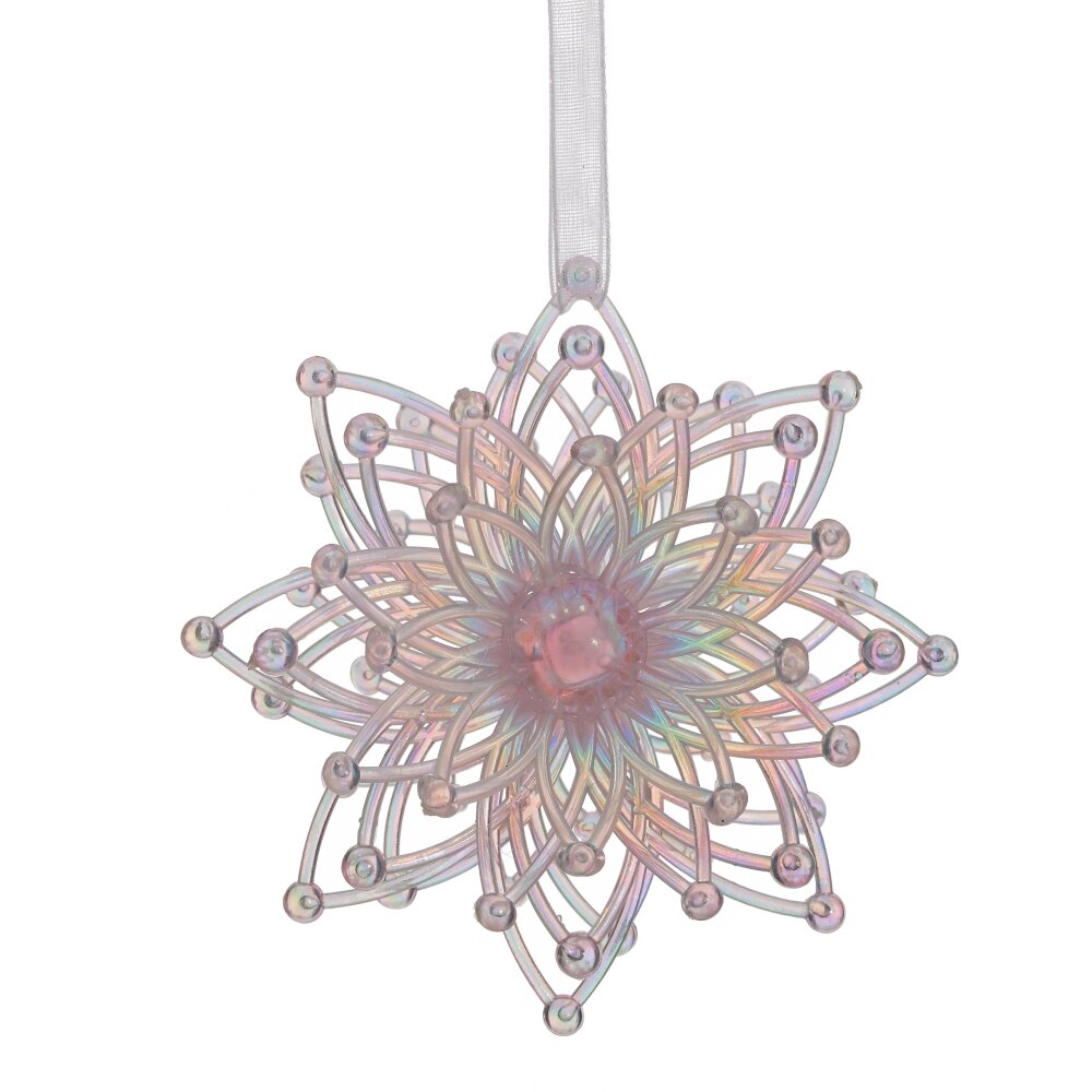 Украшение новогоднее снежинка, l10 w5 h10 см, 3в.. Материал: Полимерные материалы Новогоднее украшение Снежинка — это объемная елочная игрушка, выполненная из тонкого легкого полупрозрачного полимерного материала. Она представлена в трех изящных вариантах: с розовым, желтым и сиреневым оттенками, которые играют на свету разноцветным переливом. Эти восхитительные снежинки идеально подойдут для декорирования новогодней елки, окон или дверных проемов, создавая атмосферу волшебства и праздничного настроения. Их нежная эстетика добавит уют и чарующий блеск в ваше рождественское оформление. Вес, кг: 0. 022
