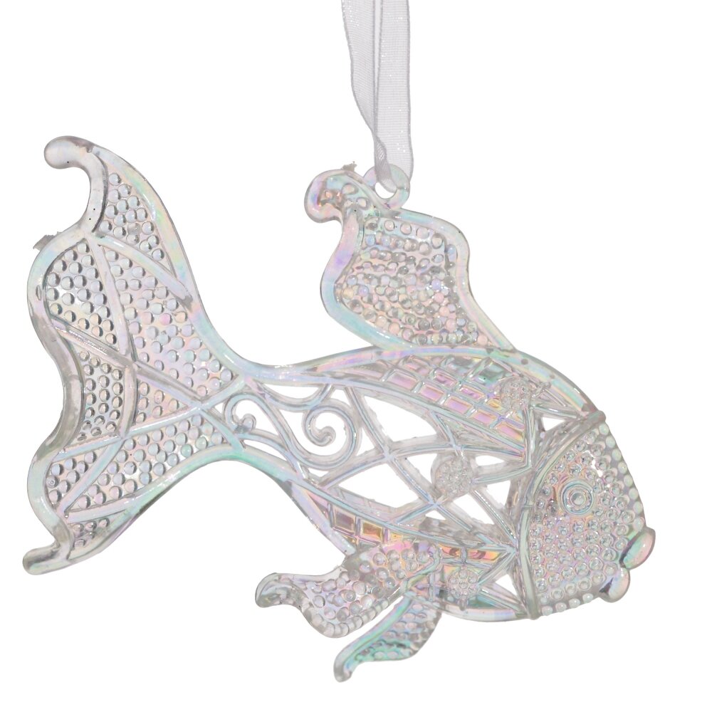 Украшение новогоднее рыба, l11 w3 h8 см. Материал: Полимерные материалы Новогоднее украшение Рыба — это элегантное изделие, выполненное из полупрозрачного полиакрила с жемчужным переливом. Эта изящная рыбка напоминает хрусталь и великолепно сверкает при любом освещении. Ее красивые плавники и хвост придают украшению грацию и легкость, создавая ощущение плавного движения. Рыба станет прекрасным акцентом на вашей новогодней ёлке и добавит волшебства в атмосферу праздника. Это украшение не только радует глаз, но и символизирует новизну и движение в наступающем году. Вес, кг: 0. 025