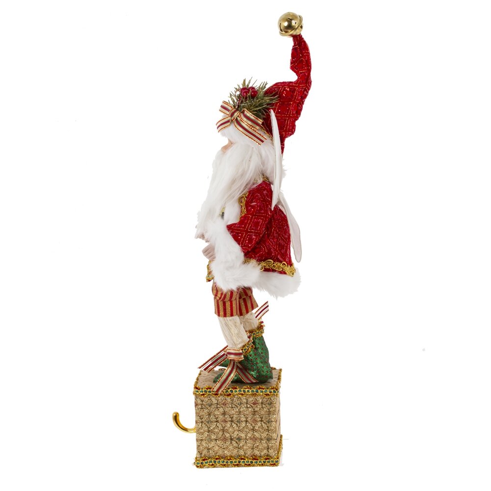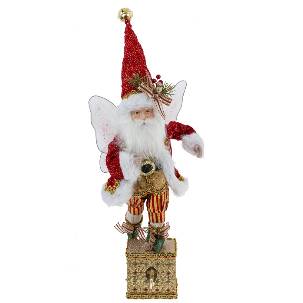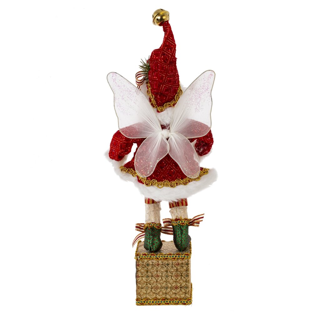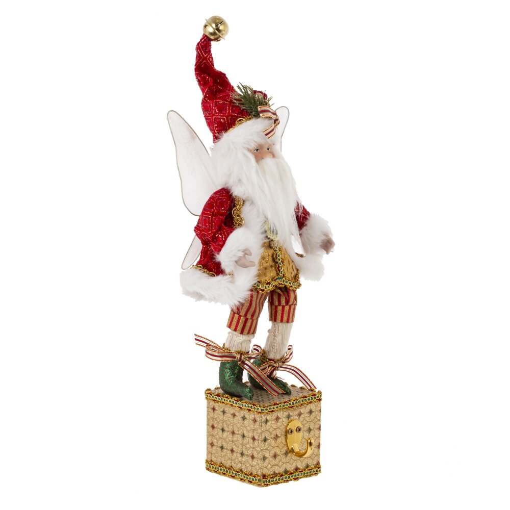 Декоративная игрушка Дед Мороз-эльф - прекрасное дополнение к новогоднему интерьеру. Этот персонаж выглядит как эльф с крылышками  в красном костюме Санты с колпаком, стоящий на золотой подставке с крючком для подвешивания носка. Реалистичные лицо и руки, выполненные из полимерных материалов, придают особый шарм этой игрушке. Он наполняет пространство таинственным и праздничным настроением.