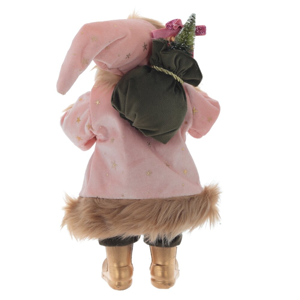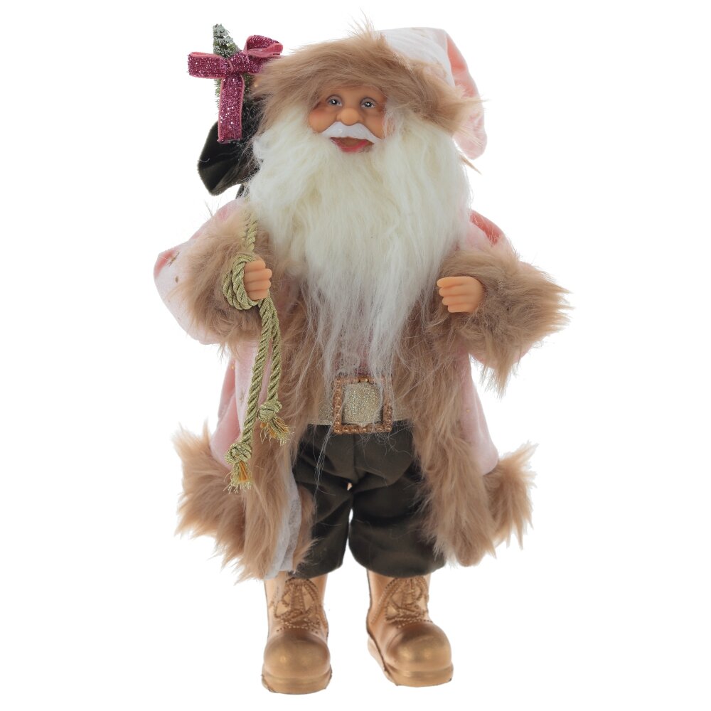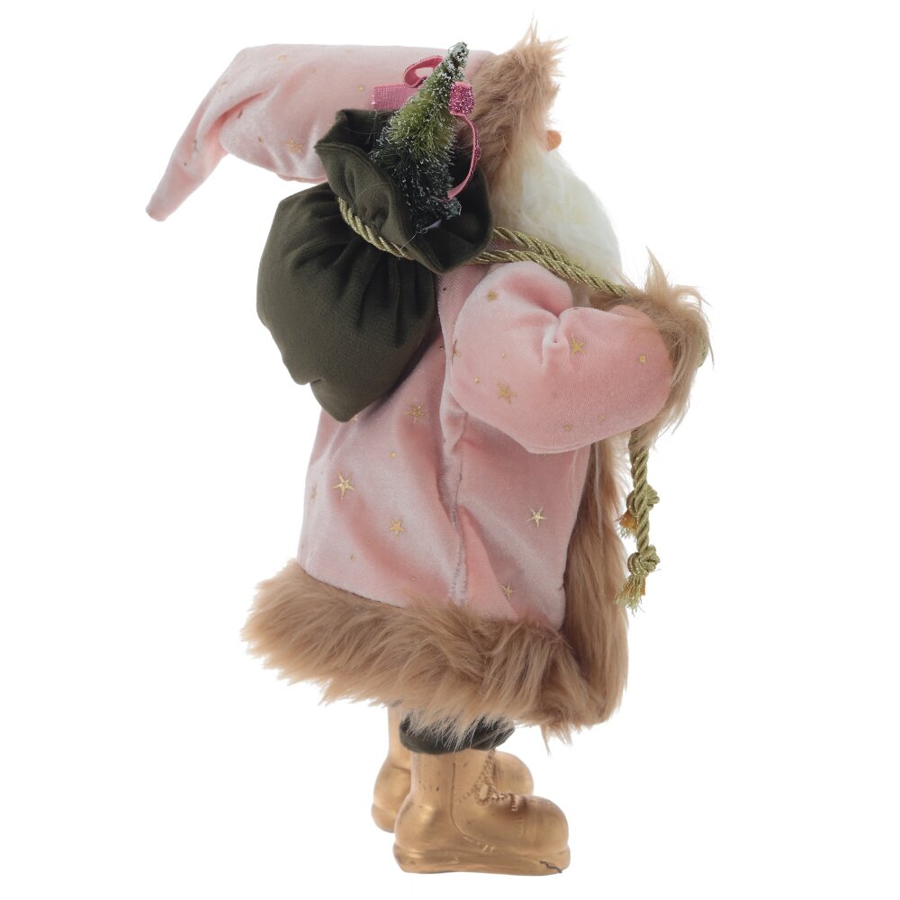 Дед мороз, l16 w14 h30 см. Материал: Полимерные материалы/Текстиль Интерьерная кукла Дед Мороз высотой 43 см — это очаровательный персонаж в розовом бархатном пальто, украшенном золотыми звездочками, с бежевой меховой отделкой. Длинный колпак гармонирует с пальто, а золотые сапожки добавляют изысканности. Лицо и руки дедушки выполнены из полимерных материалов с высокой детализацией, что добавляет реалистичности игрушке. Шикарная белая борода и добрый взгляд делают эту фигурку идеальным украшением для вашего интерьера. Мешочек с подарками завершает образ, создавая атмосферу праздника. Вес, кг: 0. 23