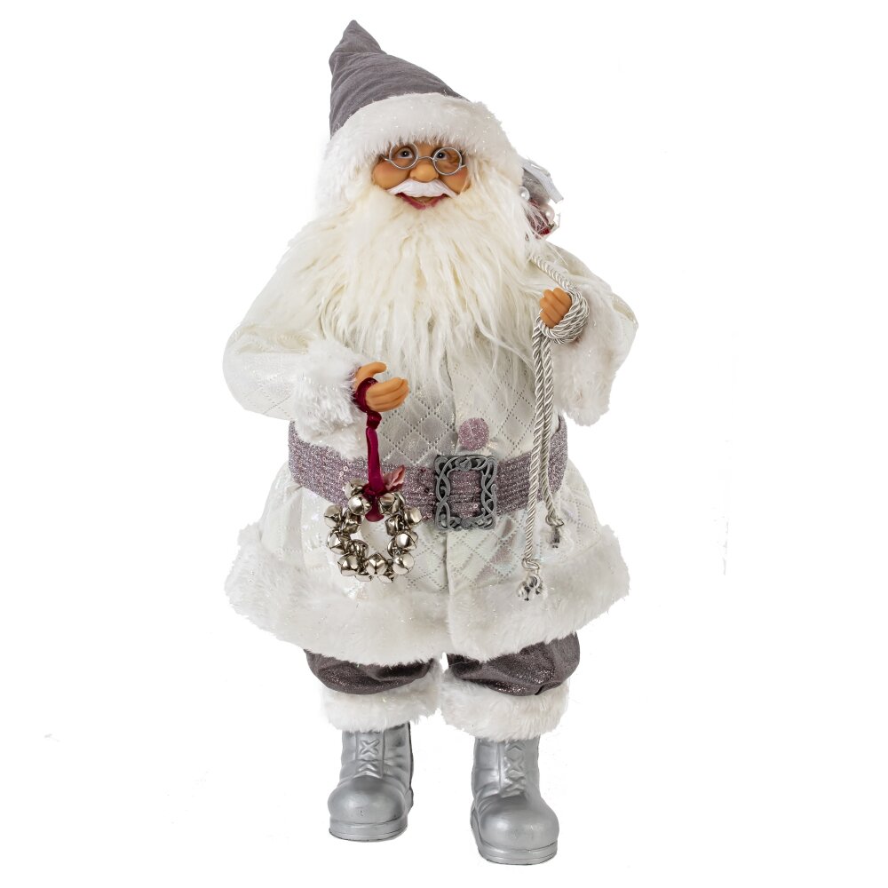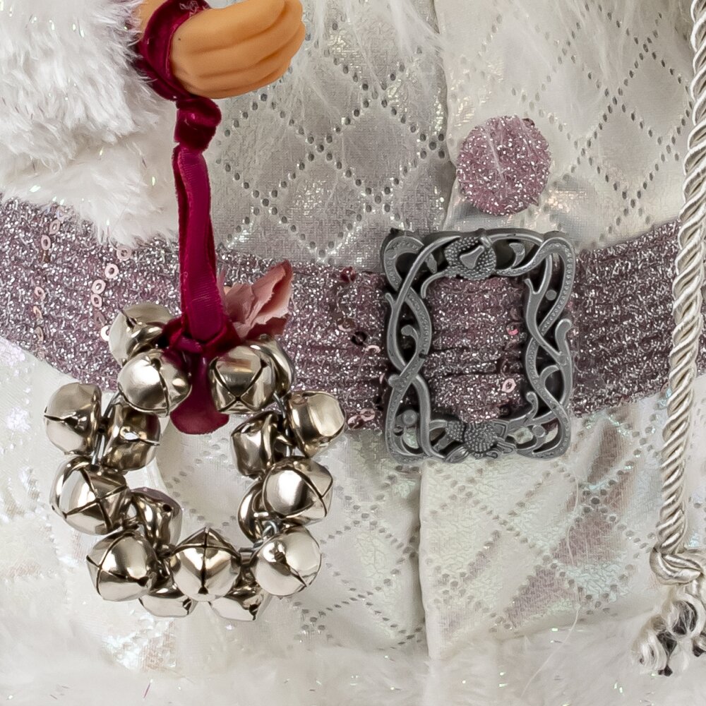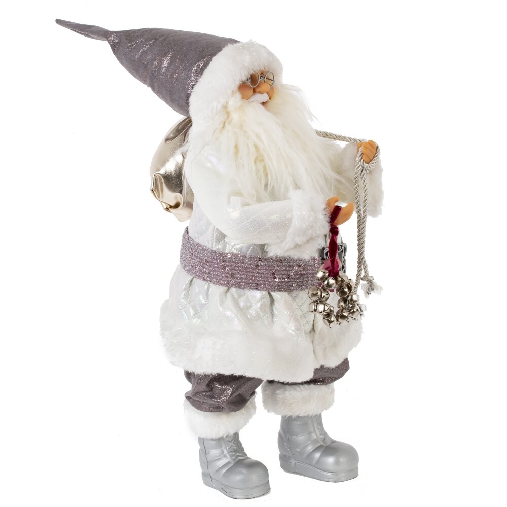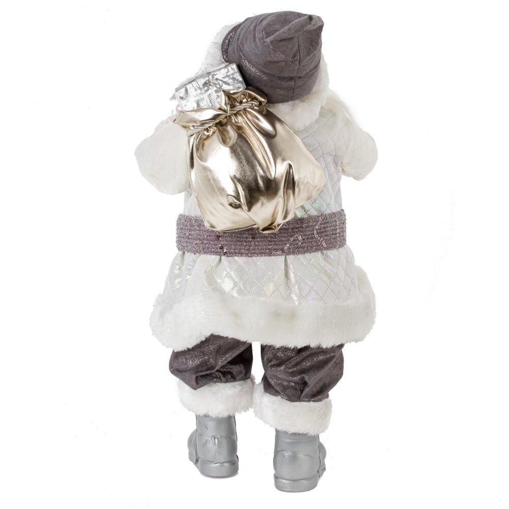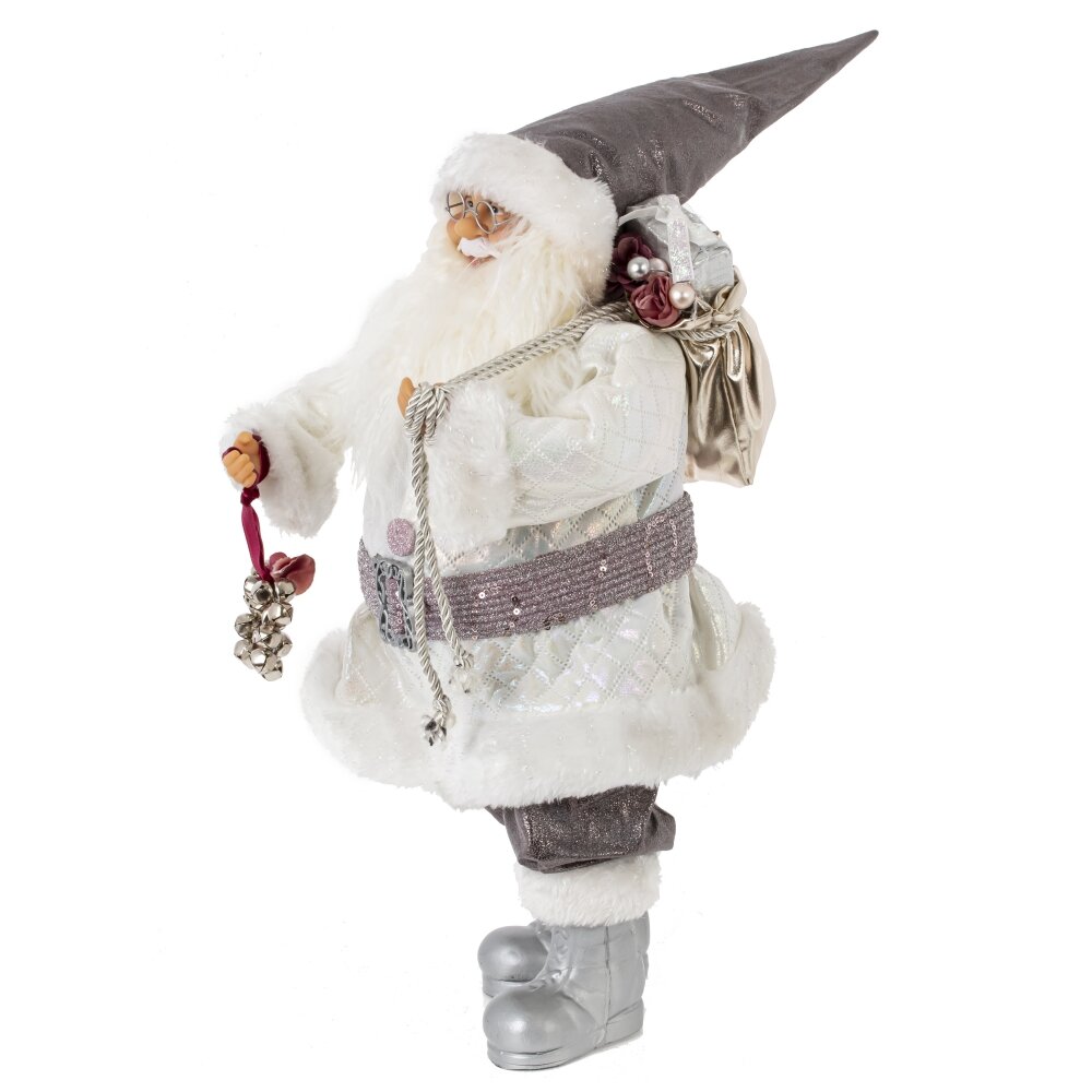 Дед мороз, l22 w23 h45 см. Материал: Полимерные материалы/Текстиль Дед Мороз — интерьерная новогодняя кукла высотой 66 см с поднятым колпаком и 46 см с опущенным. Он облачен в стильное стеганое белое пальто с меховой отделкой и розовым поясом с пайетками, что придает ему изысканный вид. Длинный колпак со встроенной проволокой позволяет легко изменять его форму. Руки, сапоги и лицо выполнены из полимерных материалов с проработанной детализацией. Улыбающееся лицо, круглые очки и мягкая белая борода создают атмосферу доброты. На плече он несет золотой мешок с подарками, а в руке — венок из серебряных бубенцов, наполняя ваш новогодний интерьер праздничным настроением и волшебством. Вес, кг: 0. 508