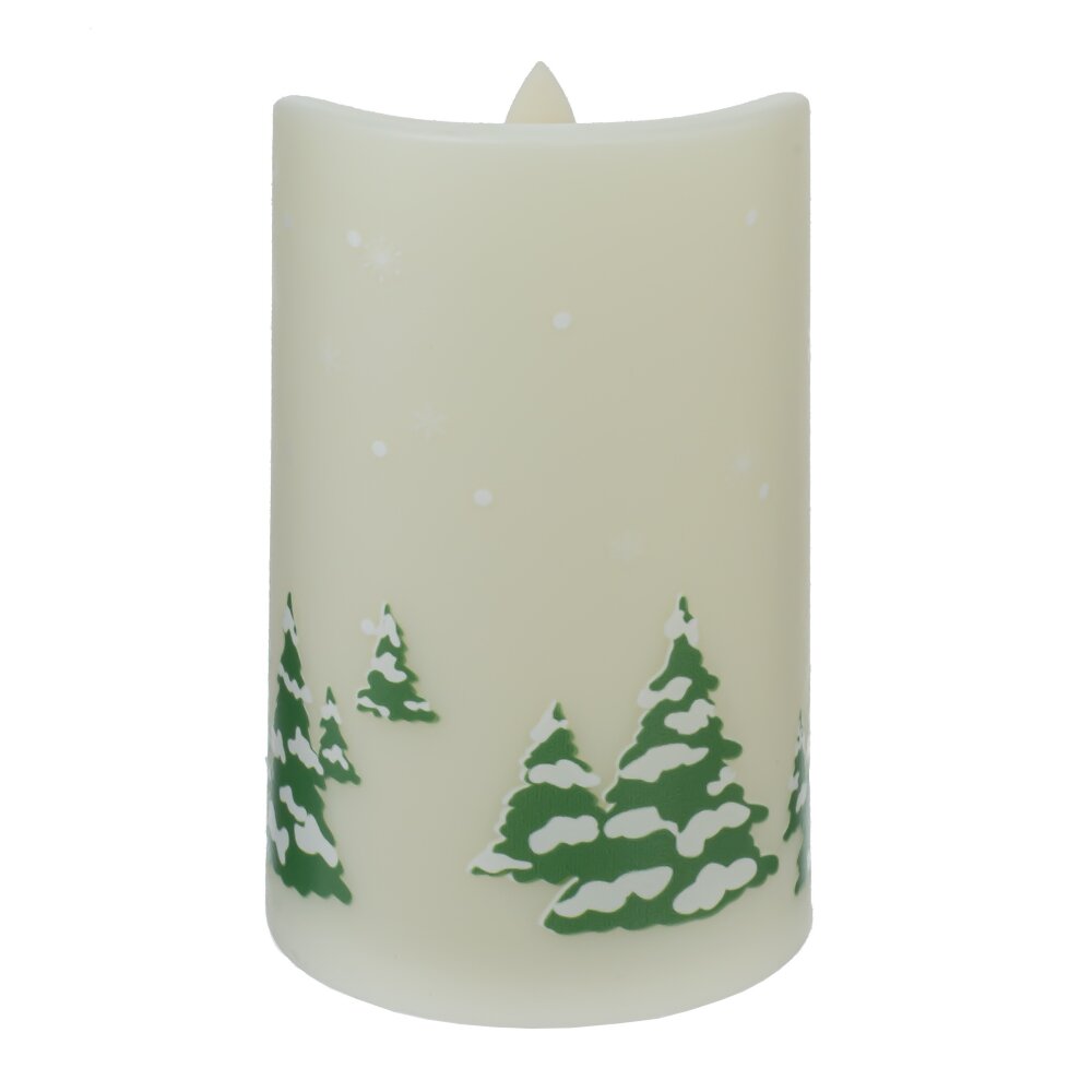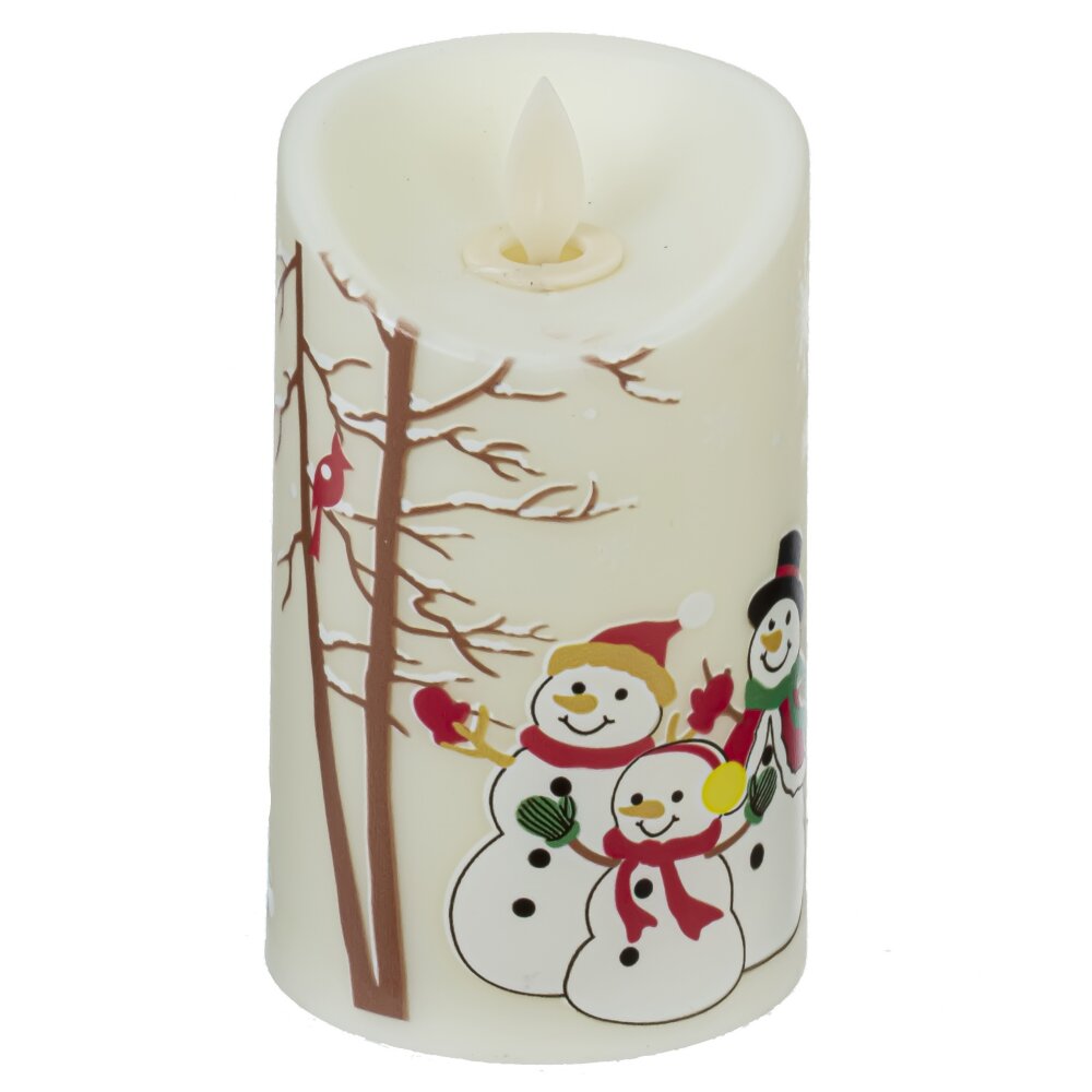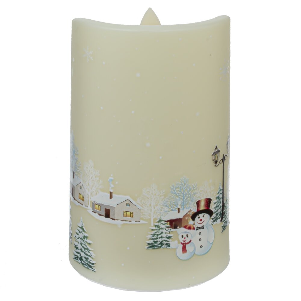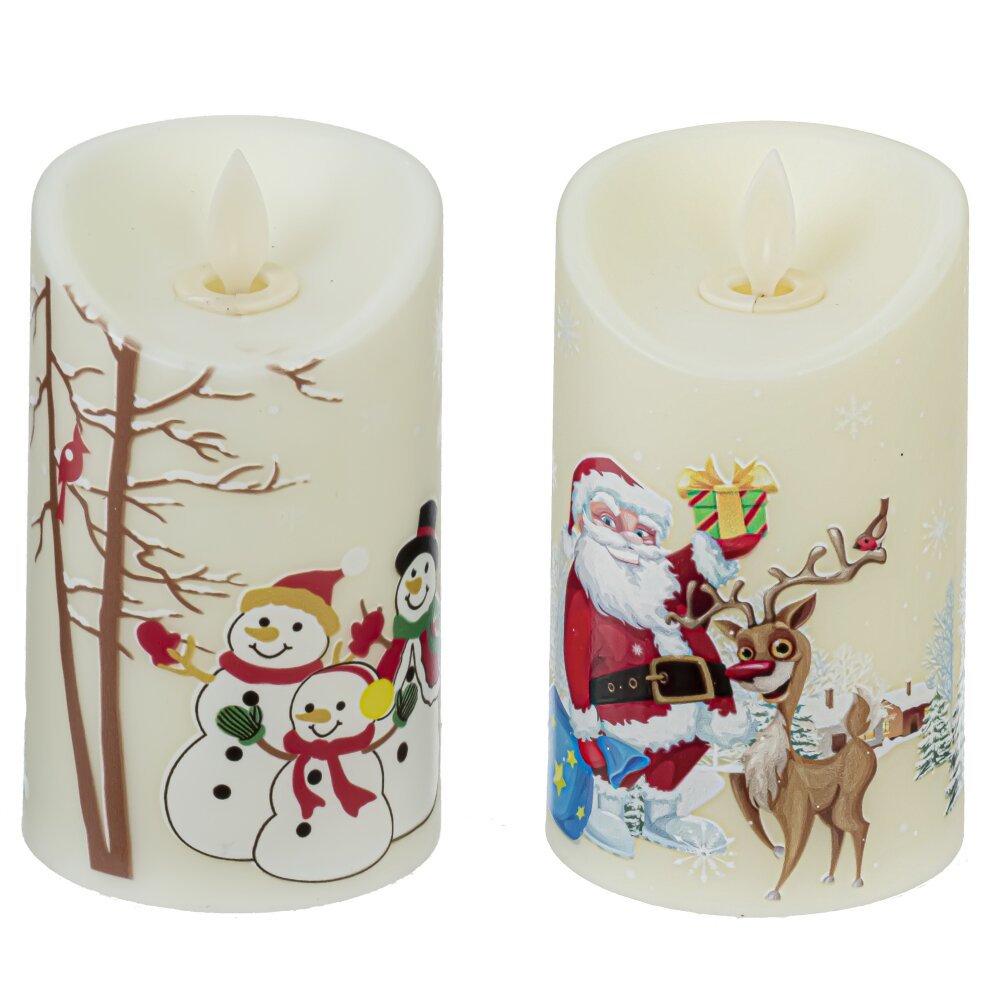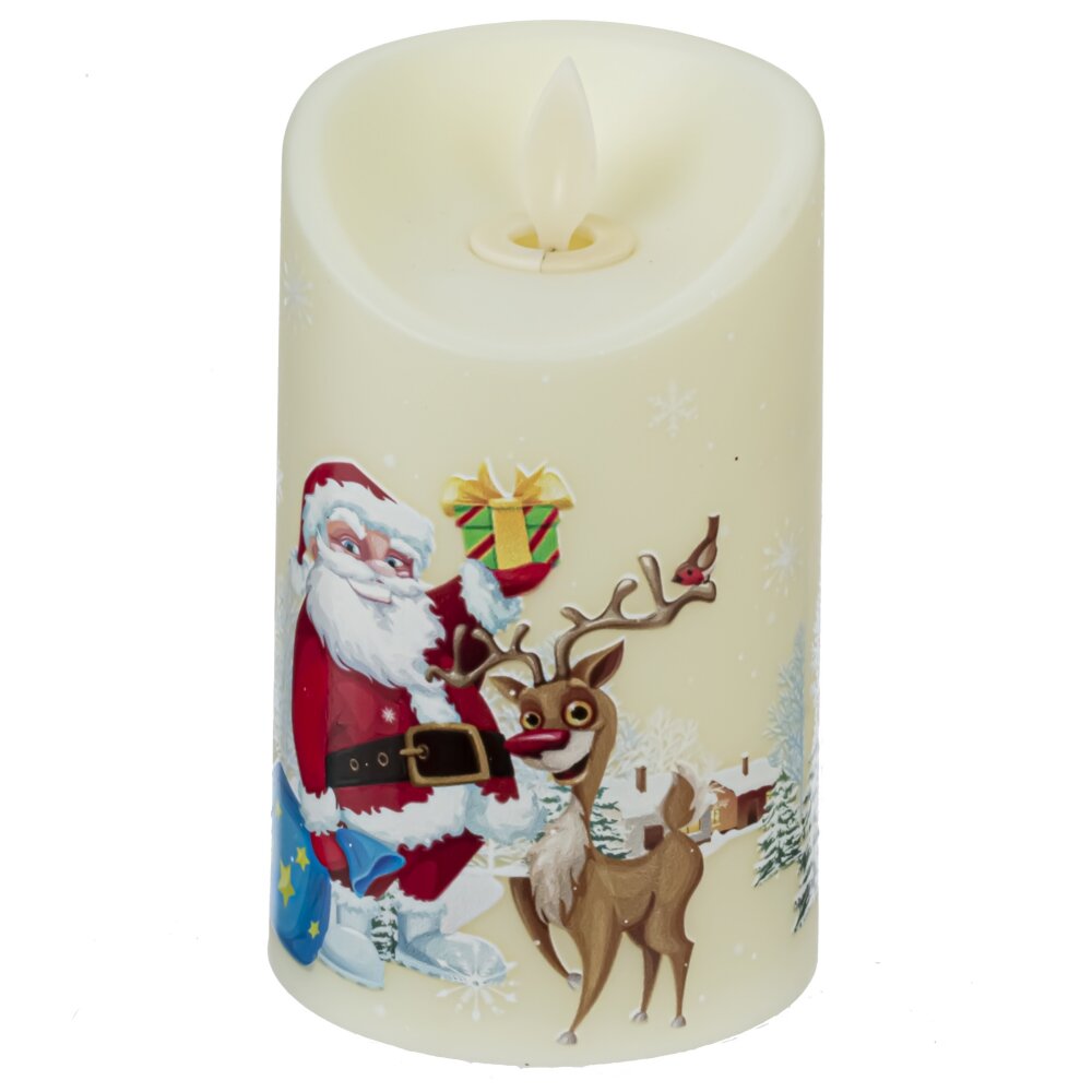 Изделие декоративное свеча (подсвет, aaaх3 н/п) l7,5 w7,5 h12,5 см, 2в.. Материал: Полимерные материалы Декоративная LED-свеча диаметром 7,5 см – это идеальное решение для создания новогоднего настроения в вашем интерьере. Она выполнена под натуральную восковую свечу и доступна в двух вариантах дизайна: с изображением снеговиков или Деда Мороза с оленем. Свеча имитирует эффект живого пламени, что добавляя уюта и тепла, при этом оставаясь совершенно безопасной для людей и животных. Работает от трёх батареек типа AAA (не прилагаются). Подарите себе и близким атмосферу праздника с этой оригинальной LED-свечой! Вес, кг: 0. 117