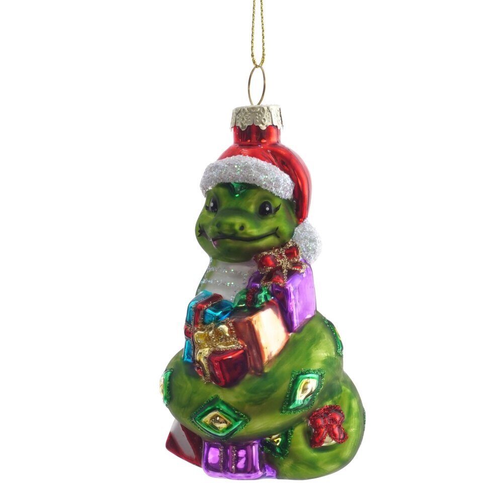 Украшение новогоднее змейка, l5,5 w5 h11 см. Материал: Стекло Прекрасная елочная игрушка из стекла Змейка в виде зеленой змейки в новогоднем колпаке, обвивающей подарки, украшена блестками, которые придают ей сверкающий вид и создают атмосферу праздника. Эта игрушка будет символичным подарком в год Зеленой змеи, символизирующей преображение, удачу и приток новых сил. Ее присутствие на елке или в новогоднем декоре напомнит о надежде на яркое будущее и принесет в дом атмосферу волшебства и добра. Вес, кг: 0. 025