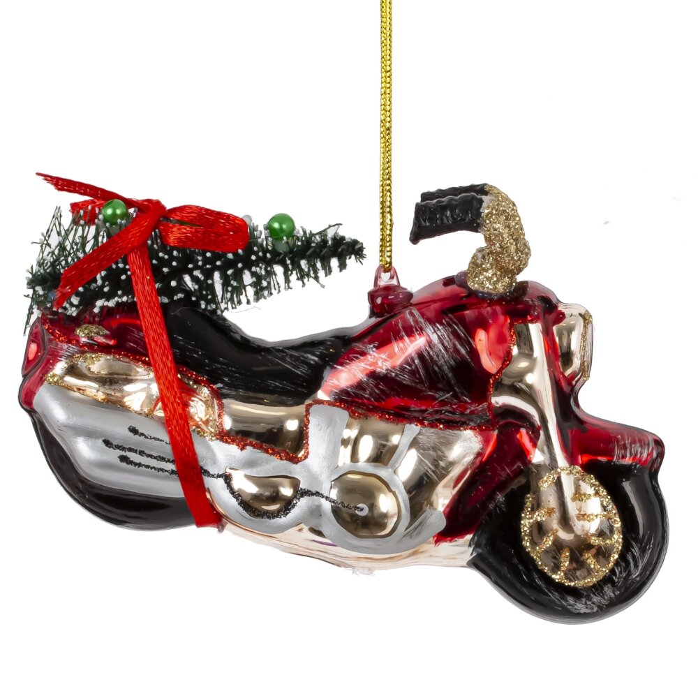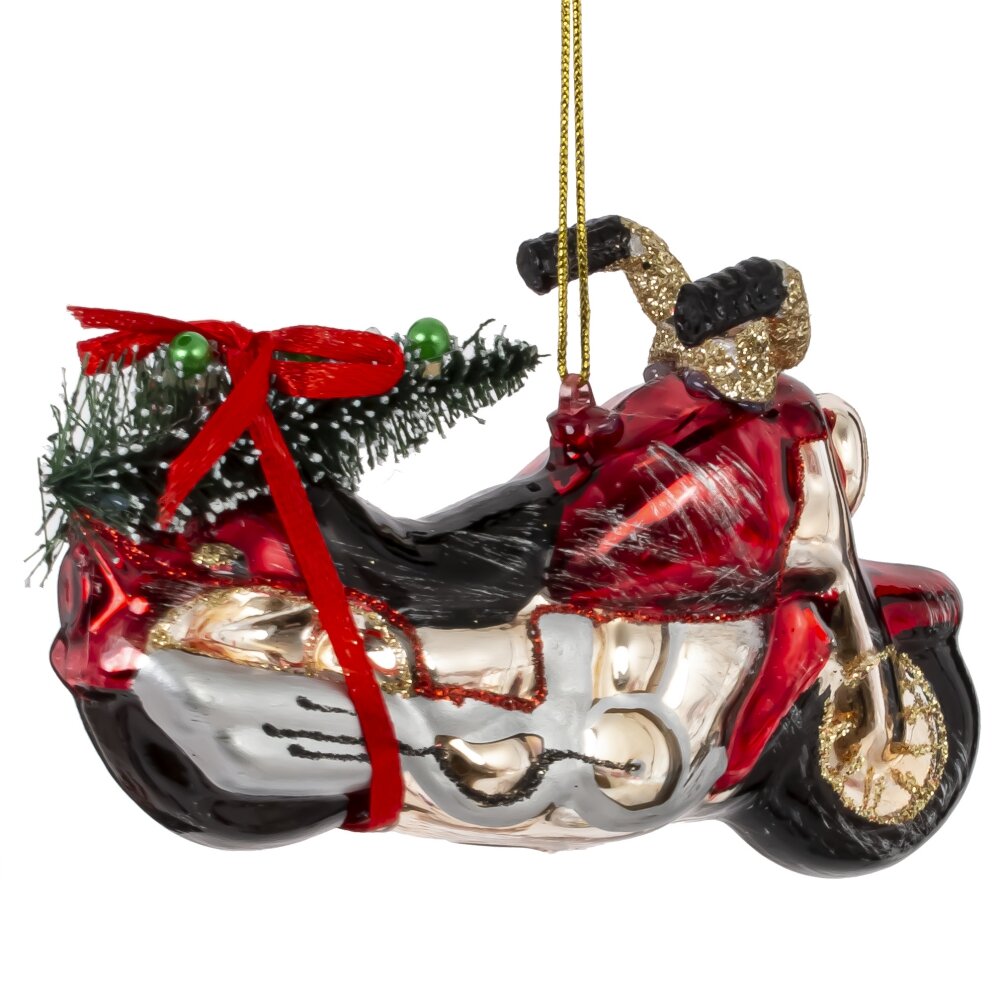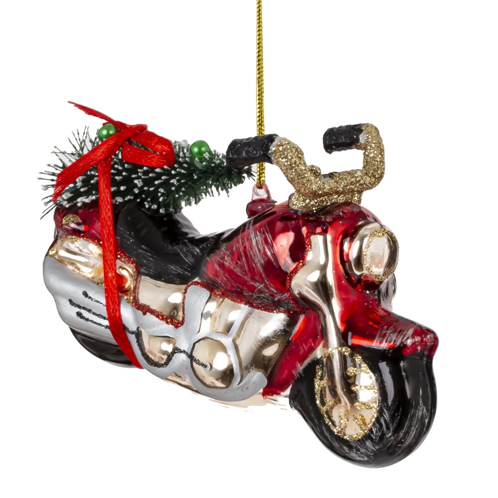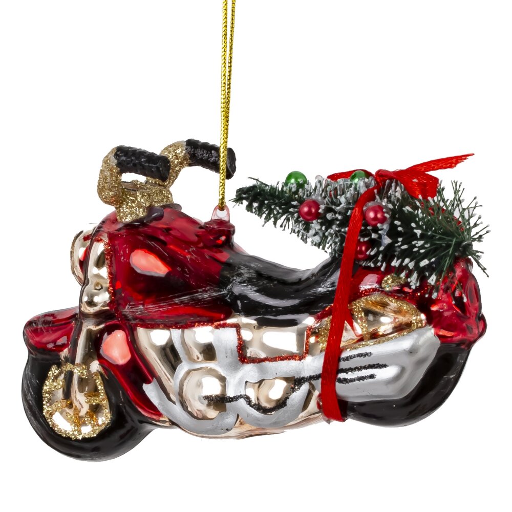 Украшение новогоднее мотоцикл, l4 w12 h6,5 см. Материал: Стекло Эффектное ёлочное украшение из стекла — мотоцикл — станет ярким и смелым акцентом вашего новогоднего декора. Фигурка выполнена с высокой детализацией: от блистательной металлической рамы до изящно проработанных колёс и руля. Глянцевая поверхность, яркие цвета и мерцающий шиммер делают украшение особенно выразительным в свете гирлянд. Мотоцикл символизирует свободу, движение и стремление вперёд — именно то, чего так хочется в новом году. Идеально подойдёт для любителей скорости, байкеров или просто поклонников оригинальных, нестандартных праздничных акцентов. Вес, кг: 0. 042