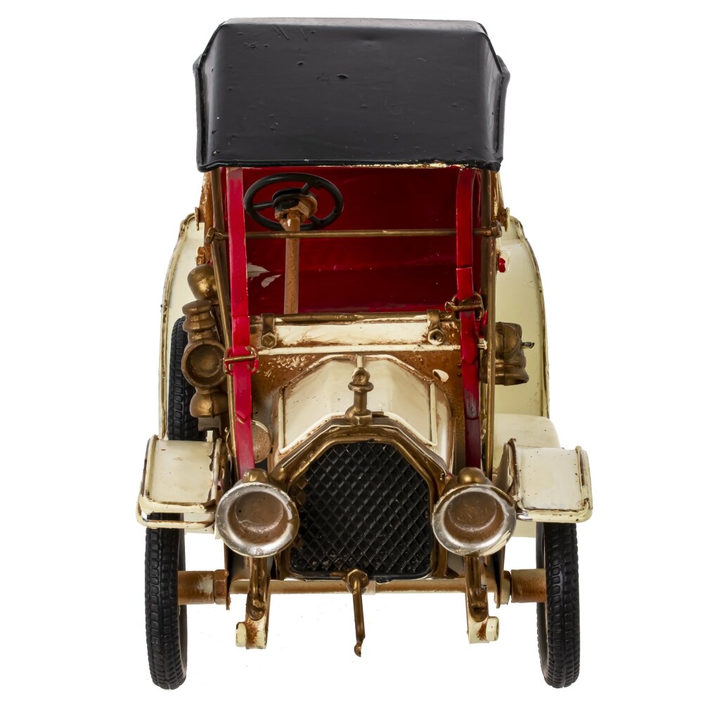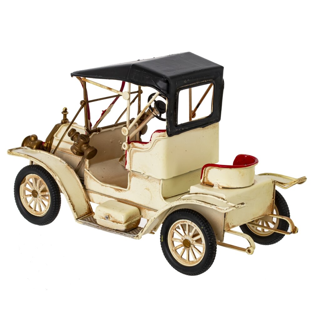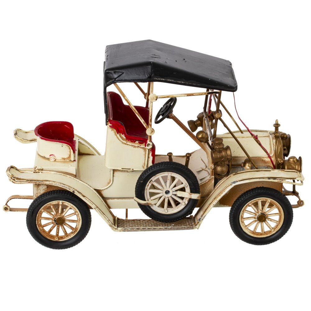 Изделие декоративное автомобиль, l24,5 w11,5 h15 см. Материал: Металл Декоративное изделие выполнено в виде ретро-автомобиля из металла. Данная миниатюрная модель старинной машины отличается высокой детализацией: прорисованы сиденья, руль, элементы кузова и фары. Тонкая работа мастера проявляется в изогнутых линиях корпуса, проработанных колёсах и аккуратно выполненном капоте. Использование сочетания золотистого, чёрного и кремового цветов придаёт изделию винтажный и элегантный вид. Такое оригинальное металлическое украшение прекрасно подойдёт для оформления интерьера в стиле лофт или ретро, станет отличным подарком коллекционерам и ценителям необычных декоративных предметов. Оно может занять достойное место на полке, каминной полке или в офисе, привлекая внимание гостей и создавая атмосферу уюта и стиля. Вес, кг: 0. 688