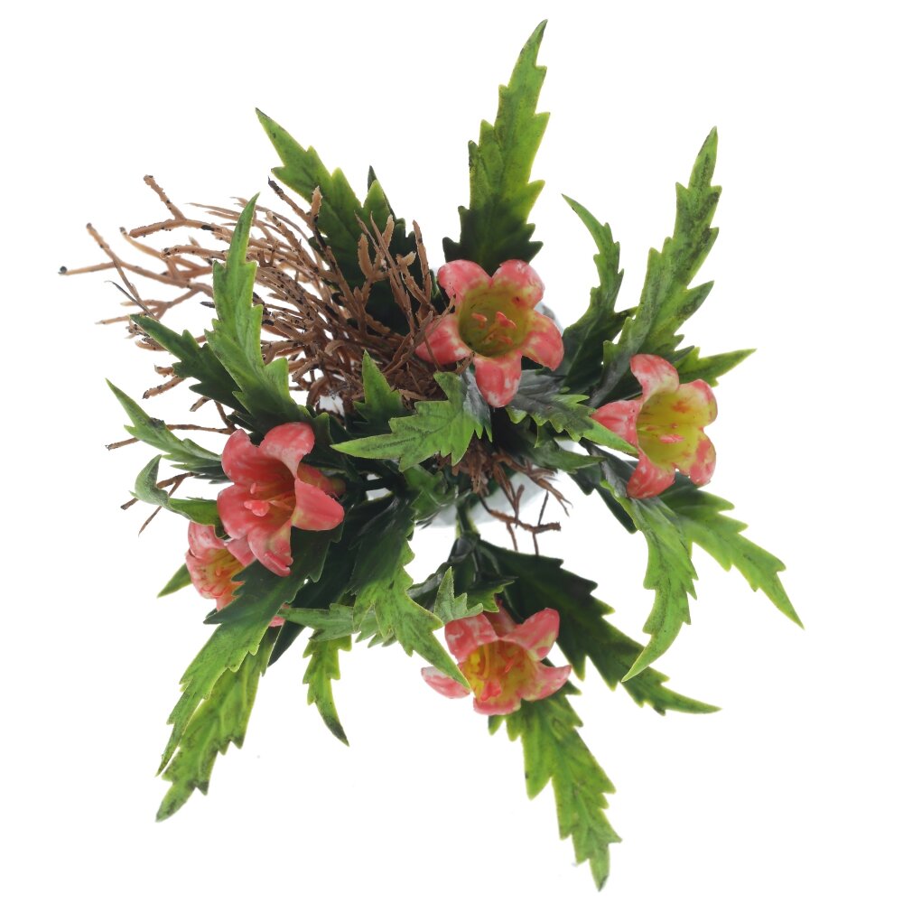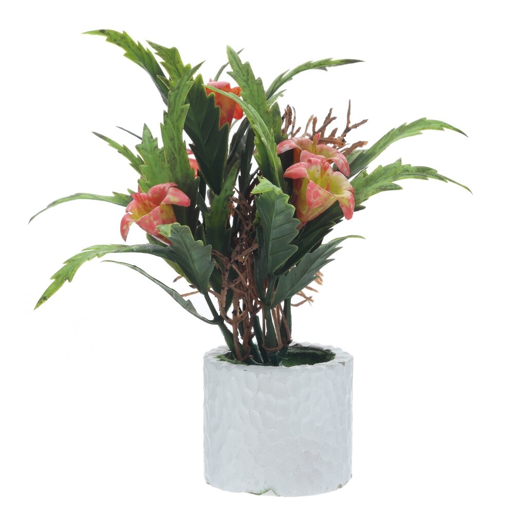 Цветочная композиция, l1 w12 h14 см. Материал: Полимерные материалы/Цемент Искусственная цветочная композиция в небольшом кашпо. Центральное место в композиции занимают розовые цветы, окружённые густыми зелёными листьями, что делает их похожими на натуральные. В дополнение к основным элементам используются декоративные веточки коричневого цвета, которые создают объём и добавляют композиции реалистичности. Кашпо невысокое, округлой формы, тёмно-коричневого цвета, имитирующее землю или керамический горшок. Такая искусственная композиция идеально подойдёт для украшения интерьера, офиса или любого другого помещения, где нет возможности ухаживать за живыми растениями, но хочется добавить яркий природный акцент. Искусственные цветы сохраняют свою форму и насыщенность цвета длительное время, не требуют особого ухода, что делает их отличным выбором для декорирования пространства. Вес, кг: 0. 167
