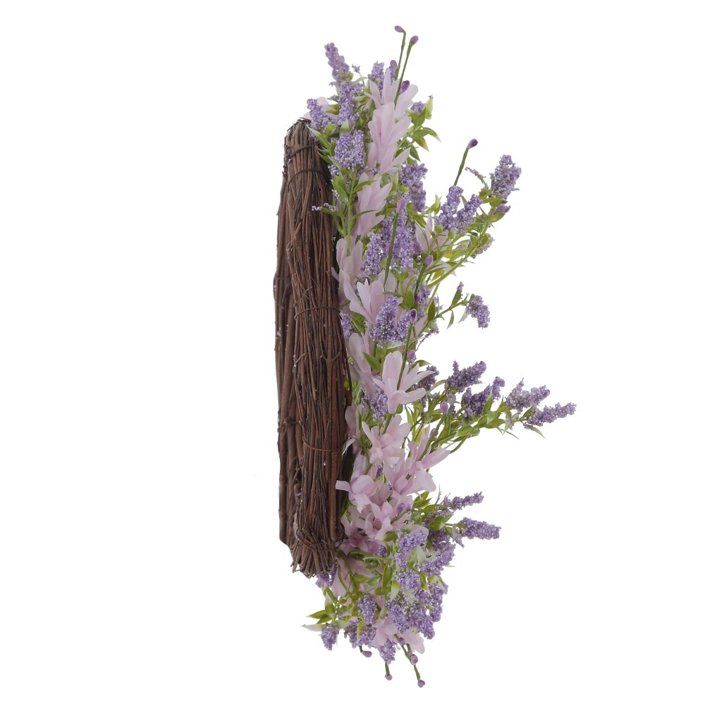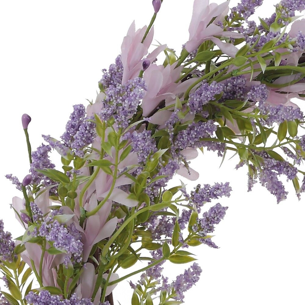 Изделие декоративное венок, l36 w8 h39 см. Материал: Полимерные материалы/Текстиль/Бумага/Металл Этот изысканный пасхальный венок диаметром 36 см выполнен из полимерных, текстильных материалов и металла, создавая гармоничное сочетание природной красоты и долговечности. Декор венка включает искусственные веточки лаванды с мелкими цветками нежного сиреневого оттенка, переплетающимися с зелёной листвой. Также в композиции присутствуют бело-розовые цветы, придающие изделию лёгкость и воздушность. Основа венка выполнена из металлического каркаса, обеспечивающего прочность и устойчивую форму. Текстильные элементы создают натуралистичный эффект, придавая украшению естественный вид. Такой пасхальный венок идеально подойдёт для декора входной двери, стены или праздничного стола, создавая атмосферу уюта, свежести и весеннего настроения. Вес, кг: 0. 47