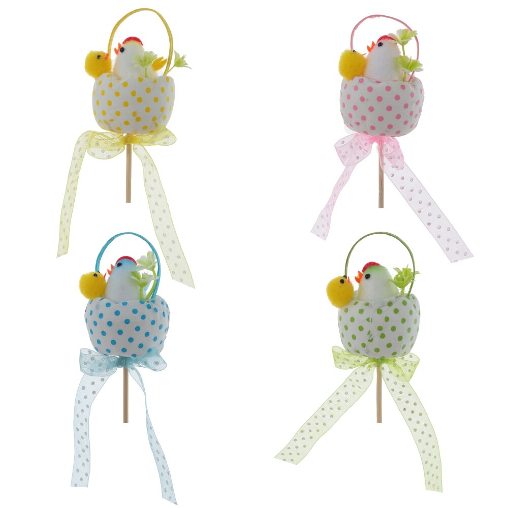 Изделие декоративное (вставка) яйцо пасхальное (4*7) (блок 12 шт), l5 w5 h26 см, 4в.. Материал: Текстиль/Дерево Декоративное изделие Яйцо пасхальное выполнено из текстильных материалов и дерева, что делает его легким и воздушным. Композиция представляет собой декоративное яйцо с милыми фигурками цыплят внутри, оформленное в светлых весенних тонах. Оно украшено горошком, атласной лентой и миниатюрной ручкой, напоминающей корзинку. Тонкая деревянная палочка позволяет удобно использовать украшение в цветочных композициях, праздничном декоре или для создания уютной атмосферы в доме. Такой элемент станет отличным дополнением к пасхальному декору и создаст праздничное настроение. Представлено в четырех вариантах. Вес, кг: 0. 004