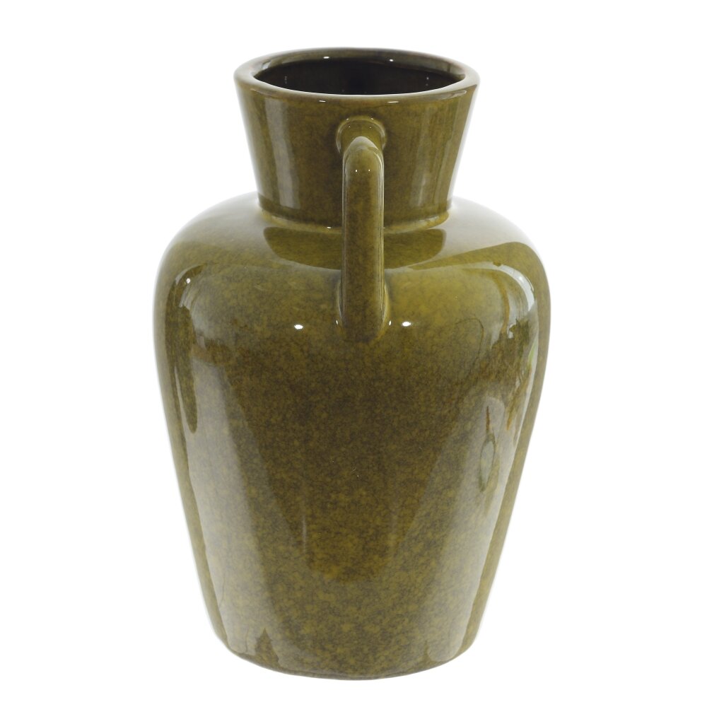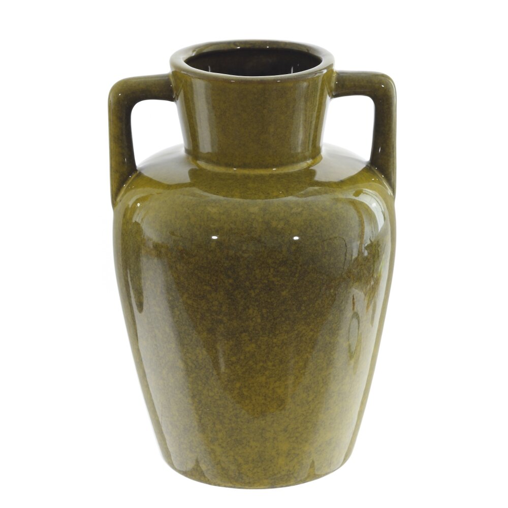 Ваза, 2200 мл, l15 w15 h23 см. Материал: Фарфор Элегантная ваза из фарфора объемом 2200 мл. Выполнена в благородном оливково?зеленом оттенке с глянцевой глазурью и легким крапчатым эффектом. Форма напоминает амфору: широкое горлышко, плавно расширяющееся тело и две удобные прямоугольные ручки. Устойчивая, с ровным дном и гладкими стенками, которые легко очищаются и не впитывают запахи. Подойдет для живых цветов, веток и сухоцветов, а также как самостоятельный интерьерный акцент. Нейтральный цвет гармонирует с минималистичными, эко и ретро?интерьерами, подчеркивает природные оттенки букетов. Объем 2,2 л обеспечивает достаточный запас воды для средних и крупных композиций. Отличный выбор для дома, офиса или в качестве подарка. Вес, кг: 1. 232
