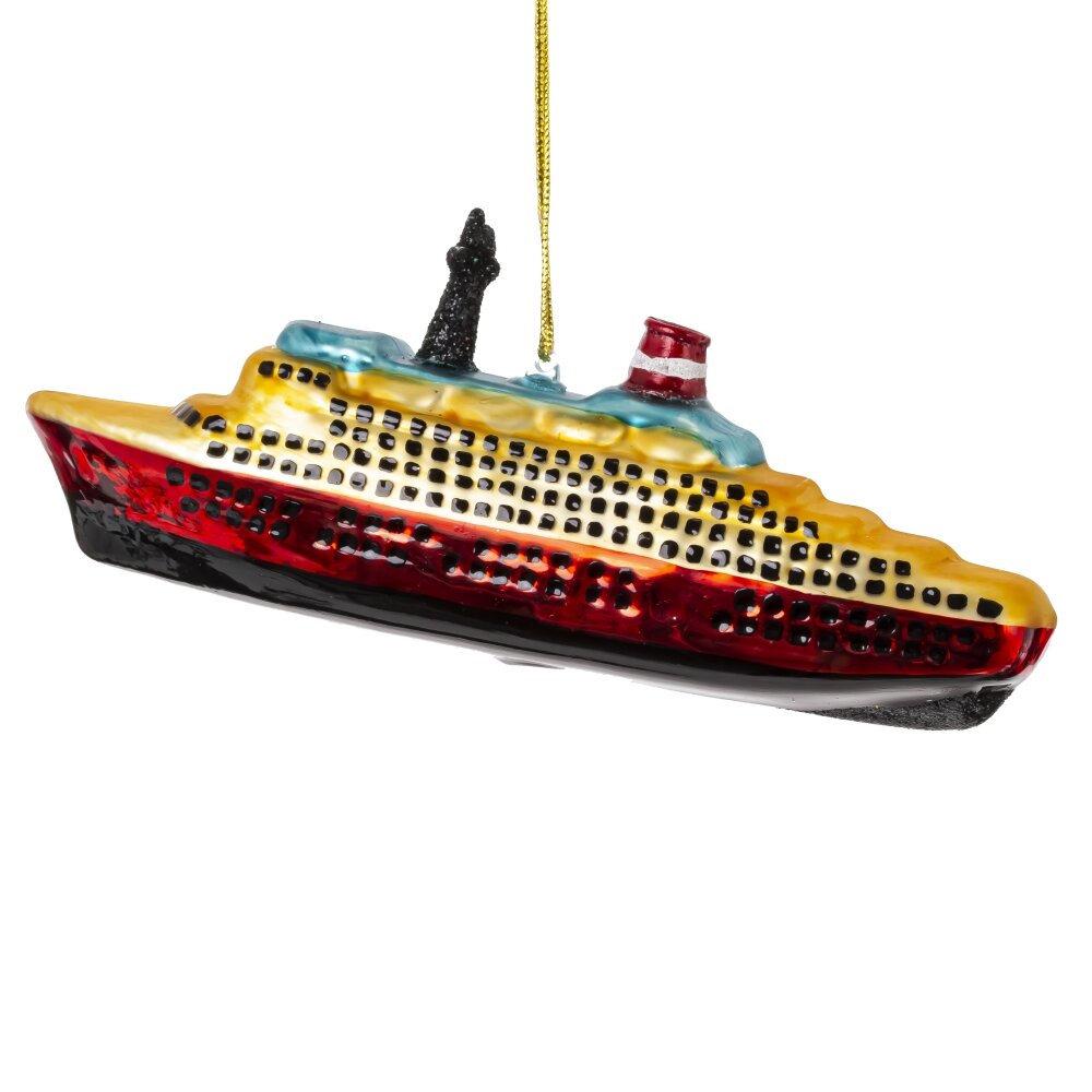 Украшение новогоднее корабль, l15 w3 h6 см. Материал: Стекло Эффектное елочное украшение в виде стеклянного корабля, исполненного в роскошных красно-золотых тонах, станет настоящей изюминкой новогоднего декора. Богатое цветовое сочетание, изысканный блеск и тонкая проработка деталей придают игрушке праздничный, почти сказочный вид. Корабль словно плывёт сквозь зимнюю ночь навстречу мечтам и новогодним чудесам. Это украшение идеально подойдёт для стильной ёлки, создавая атмосферу уюта, волшебства и ожидания чего-то прекрасного. Вес, кг: 0. 042