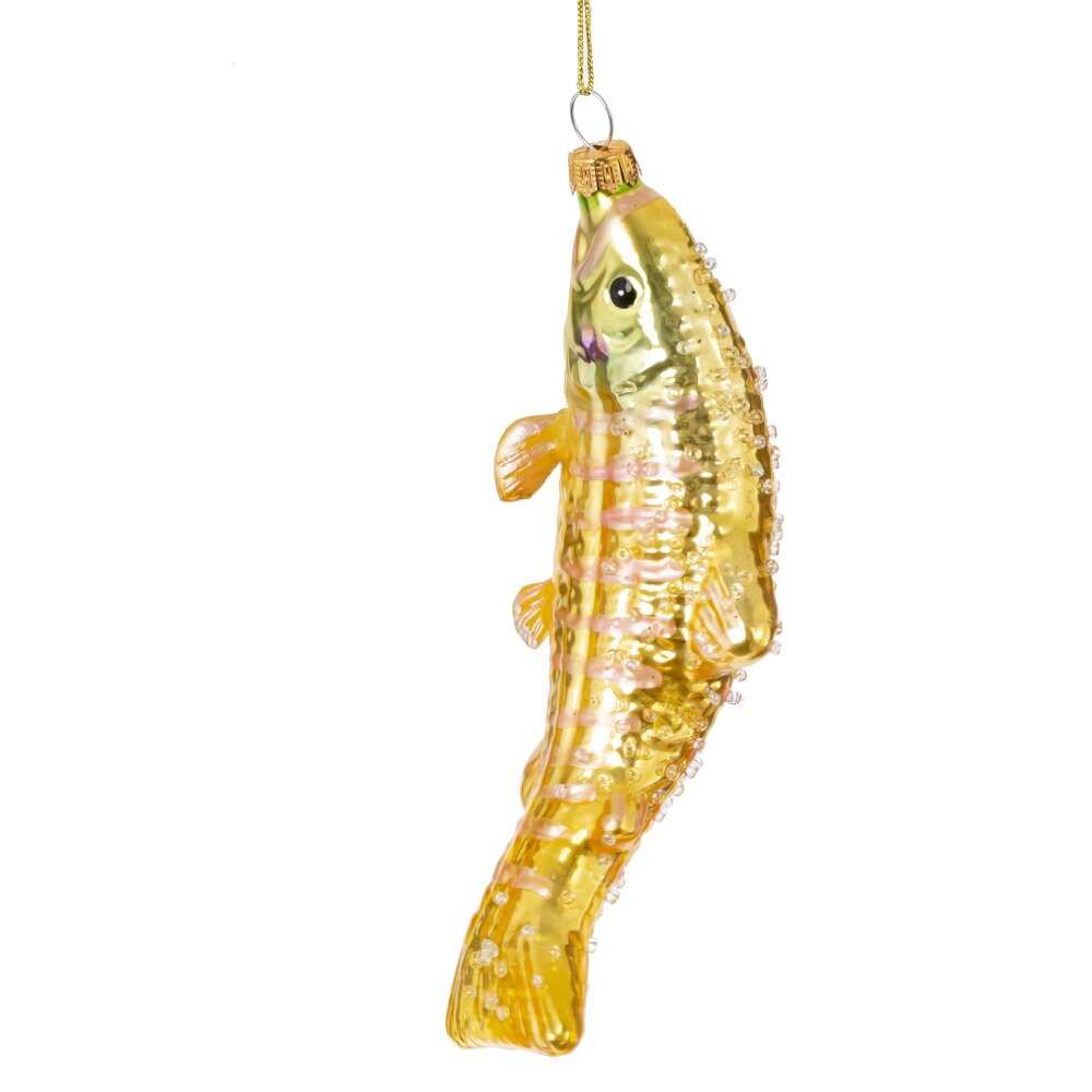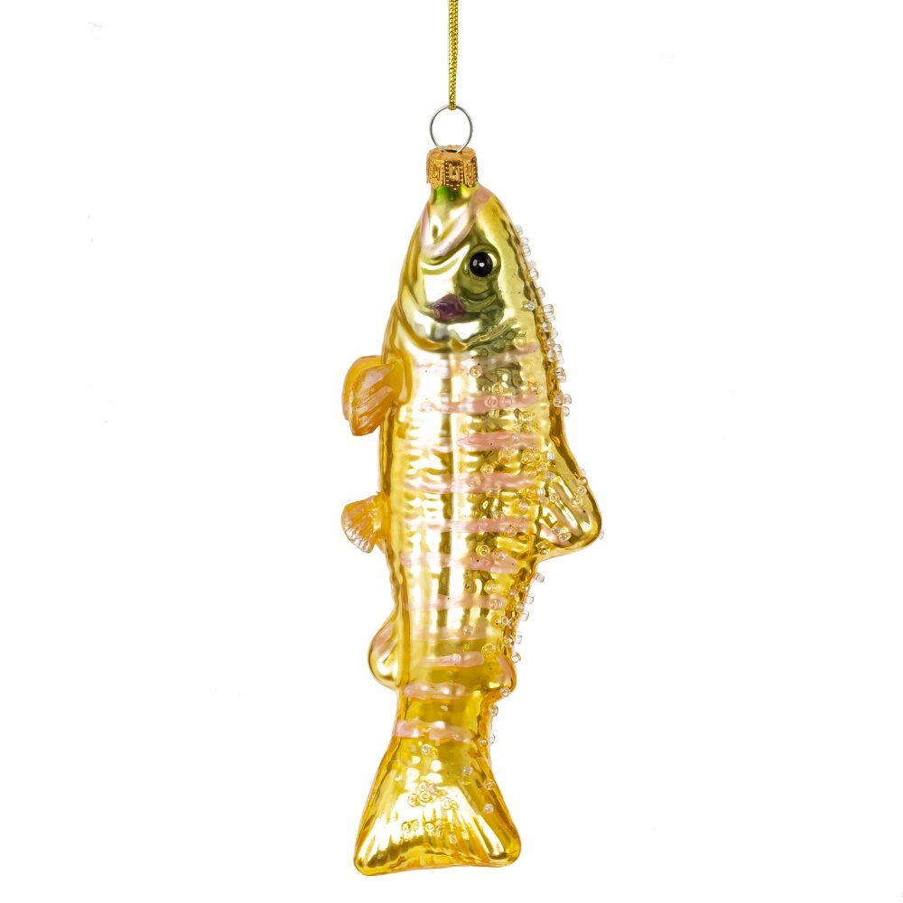 Украшение новогоднее рыба, l6 w6 h16 см. Материал: Стекло Уникальное елочное украшение из стекла — рыба, выполненная в изысканных бело-золотых тонах, украшенная нежным бисером и мерцающим шиммером — станет настоящим украшением вашей новогодней ёлки. Тонкая работа подчёркивает плавные линии и изящные детали, придавая фигурке лёгкость и утончённость. Блестящие элементы переливаются в свете гирлянд, создавая волшебную игру света и создавая атмосферу роскоши и праздника. Такое украшение идеально впишется в стильный, элегантный декор и станет эффектным акцентом, который привлечёт внимание и подарит радость в зимние праздники. Вес, кг: 0. 042