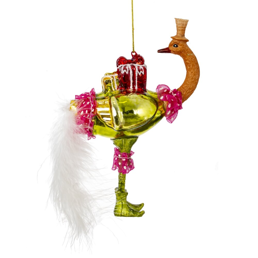 Украшение новогоднее страус, l10 w5 h14 см. Материал: Стекло Это стеклянное украшение в виде страуса выполнено в ярких, насыщенных цветах, которые сразу привлекают внимание и добавляют праздничного настроения в любой интерьер. Фигура изящно расписана, что придаёт ей уникальность и живость, а использование контрастных оттенков подчёркивает детали и формы птицы. Особый шарм изделию придаёт настоящее перо, аккуратно закреплённое на хвостовой части, которое создаёт эффект живой текстуры и воздушности. Стекло блестит и переливается на свету, отражая лучи гирлянд и создавая атмосферу волшебства. Такое украшение станет необычным и выразительным акцентом на новогодней ёлке или праздничной композиции, привнося элемент экзотики и изящества. Благодаря своему качественному исполнению и оригинальному дизайну, этот страус может стать не только красивым декоративным элементом, но и памятным подарком, который будет радовать глаз и душу многие годы. Вес, кг: 0. 042