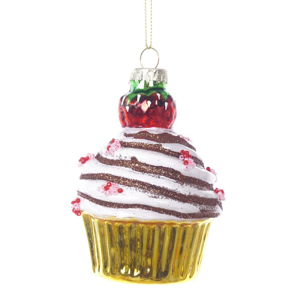 Украшение новогоднее пирожное, l7 w7 h11,5 см. Материал: Стекло Новогоднее украшение из стекла в виде аппетитного кекса — это оригинальный и яркий элемент праздничного декора, который добавит в интерьер нотку уюта и веселья. Фигурка кекса реалистично выполнена с тщательной проработкой деталей: верх украшен глазурью, имитирующей сладкое покрытие, дополненной блестками и декоративной посыпкой. Цветовое оформление в традиционных новогодних оттенках делает игрушку особенно нарядной и праздничной. Стеклянная поверхность красиво переливается при освещении, создавая эффект сияния. Такое украшение прекрасно подойдёт для украшения ёлки, новогоднего венка или сладкой тематической композиции, добавляя интерьеру тепло и праздничное настроение. Вес, кг: 0. 046