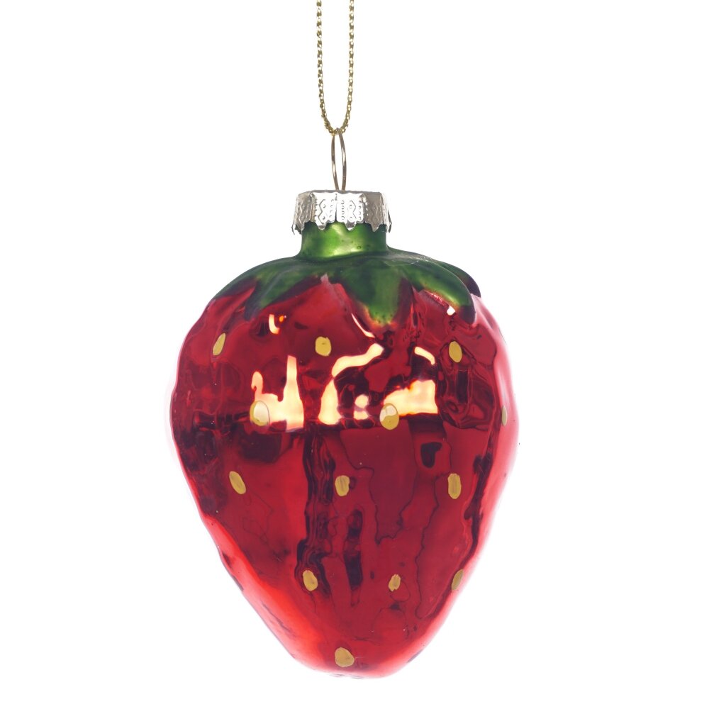 Украшение новогоднее клубника, l5,5 w5 h8,5 см. Материал: Стекло Необычное и яркое новогоднее украшение из стекла в виде клубники добавит вашему праздничному декору свежести, игривости и оригинального шарма. Выполненная из тонкого стекла, фигурка клубники детализирована до мелочей: насыщенный красный цвет, фактурная поверхность, зелёные листочки и лёгкий блеск создают эффект настоящего ягодного лакомства. Благодаря глянцевому покрытию и блестящим акцентам, украшение красиво переливается в свете гирлянд, привлекая внимание и вызывая улыбки. Такая клубничка прекрасно подойдёт для классической или креативной ёлки, станет изюминкой коллекции и оригинальным подарком для ценителей нестандартных новогодних украшений. Вес, кг: 0. 014