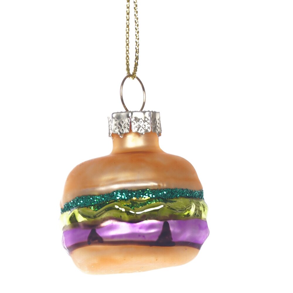 Украшение новогоднее гамбургер, l3,5 w3,5 h4,5 см. Материал: Стекло Необычное и забавное ёлочное украшение в виде гамбургера выполнено из стекла и станет ярким акцентом в новогоднем декоре. Детализированная проработка ингредиентов — булочка с кунжутом, лист салата, котлета, сыр и томаты — придаёт игрушке реалистичность и вызывает улыбку. Глянцевая поверхность с лёгким блеском делает гамбургер эффектным и заметным на фоне хвои. Такое украшение добавит игривого настроения и оригинальности классической праздничной ёлке. Оно идеально подойдёт для кухни, интерьера кафе или просто как креативный элемент в коллекции необычных новогодних игрушек. Вес, кг: 0. 005