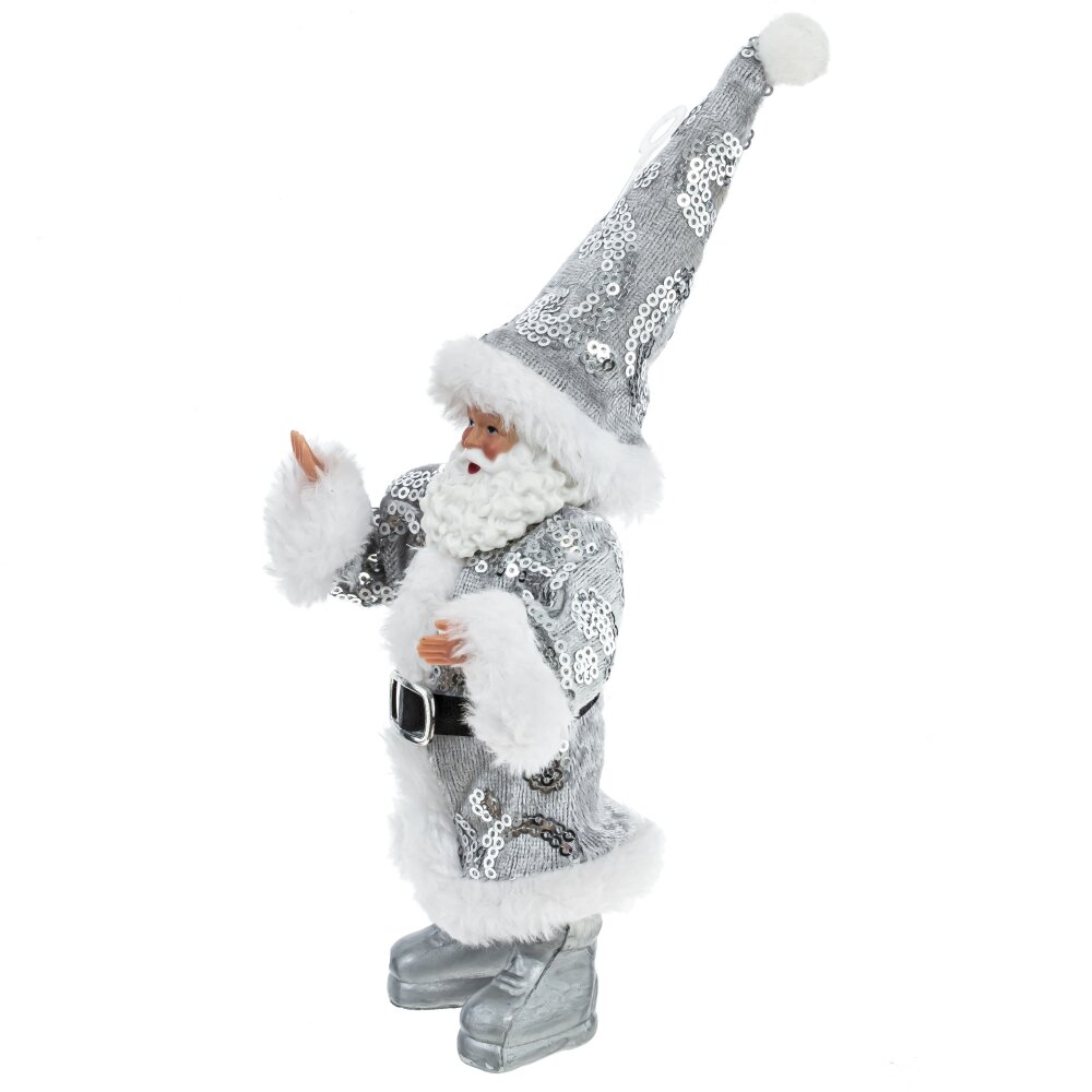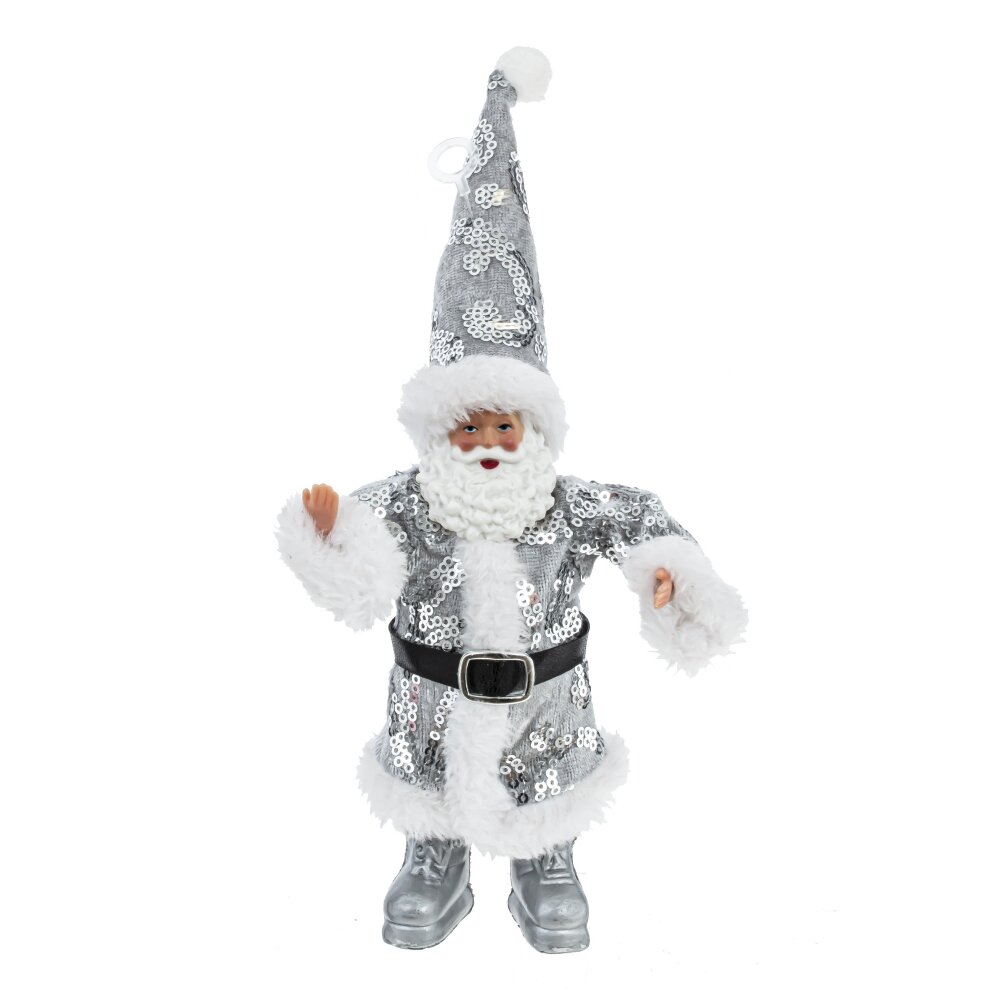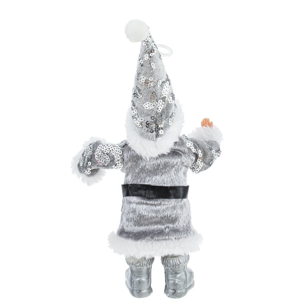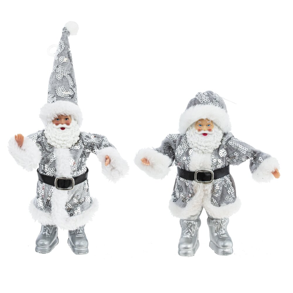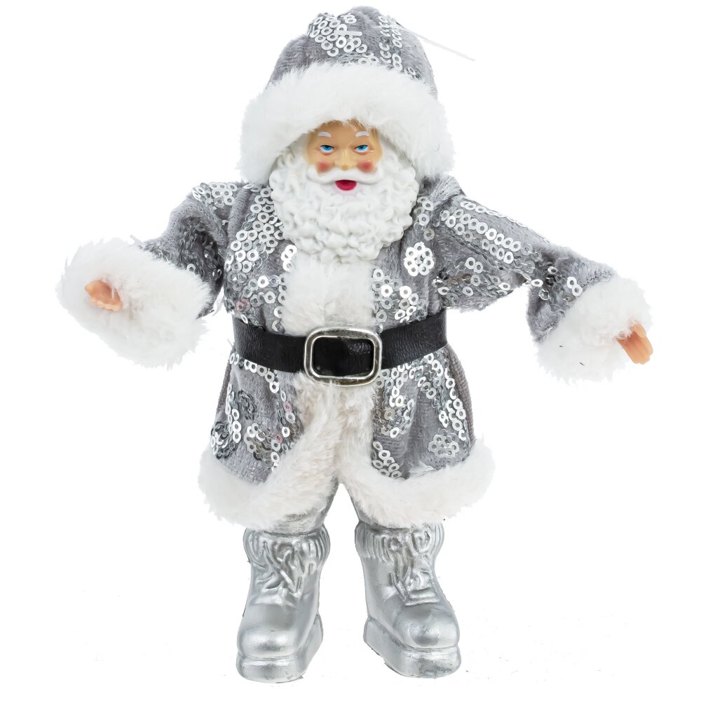 Небольшой интерьерный  Дед Мороз порадует вас своим праздничным обликом. Голова, кисти рук и ботинки игрушки выполнены из полимерных материалов, что придает образу реалистичности. Главный волшебник праздника одет в нарядный серебряный костюм из велюра, украшенный пайетками. Белая меховая отделка дополняет образ, придавая ему аристократичность и торжественность. Эта игрушка представлена в двух вариантах: один в шапке, другой в длинном колпаке. Этот симпатичный Дед Мороз станет прекрасным украшением вашего дома и наполнит его волшебством и радостью праздника, а его компактный размер позволит разместить его на полке, столе или комоде.
