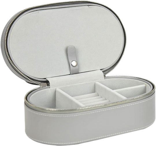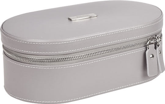 Удобный футляр коллекции Dulwich для хранения украшений с внешней отделкой из натуральной кожи серого цвета. Внутренняя отделка выполнена из велюра белого цвета. Верхнее часть в крышке с откидным зеркалом состоит из одного обычного отделения и двух креплений для украшений. В нижнем ярусе расположены три глубоких отделения и отделения для хранения колец и сережек. Футляр закрывается на молнию.