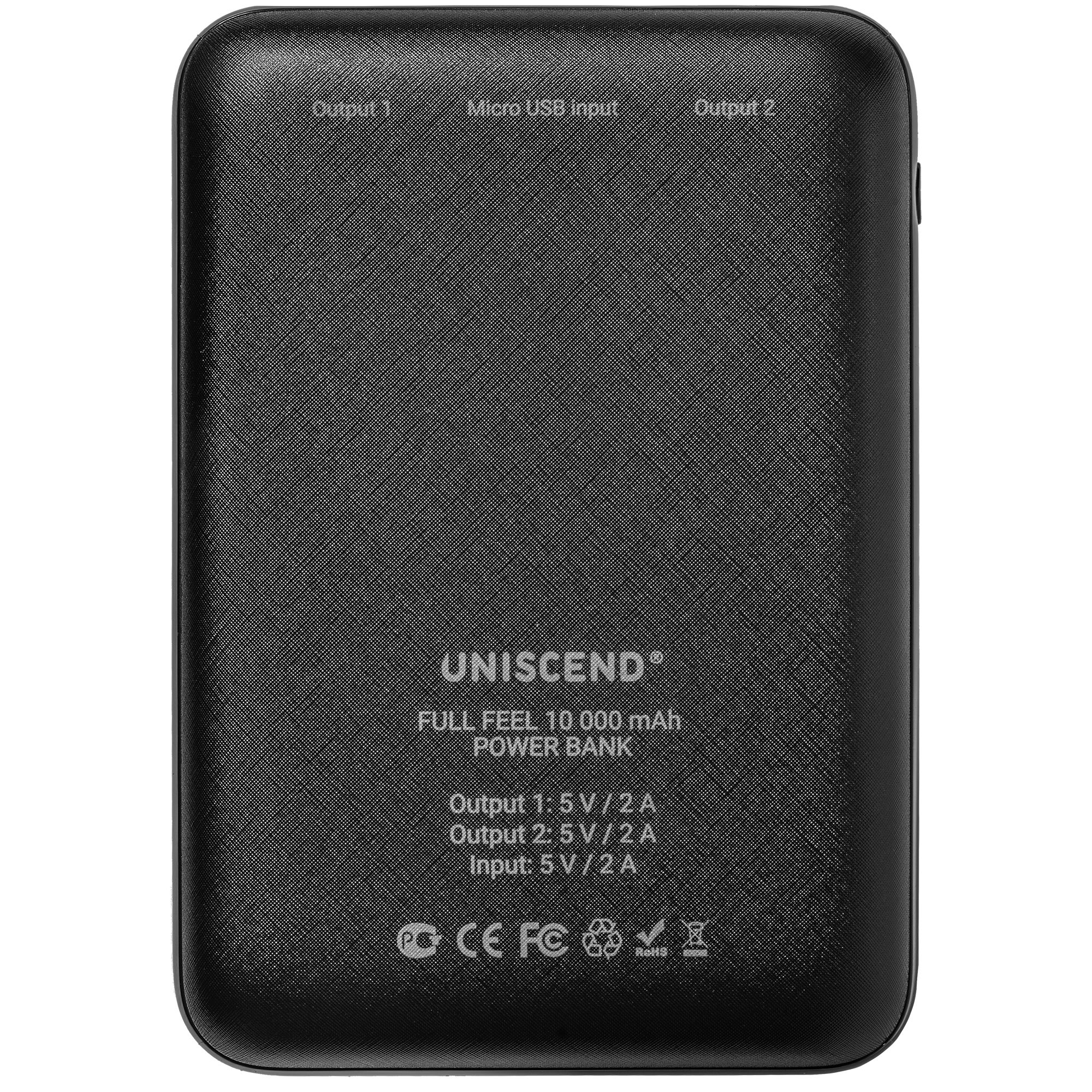 Внешний аккумулятор uniscend full feel 10000 mah, черный. Размеры 8,9x6,3x2,1 см; упаковка: 14x8x2,8 см Материал пластик Вес (1 шт.) 240 г Транспортная упаковка 31,0x30,0x20,0 см Вес 9,60 кг Объем упаковки 0,019 м? Количество в упаковке 40 шт. Виды нанесения A2-Тампопечать UV-УФ-печать Емкий и компактный аккумулятор с площадью корпуса меньше, чем у современного смартфона. Позволит весь день пользоваться и планшетом, и смартфоном и не займет много места в сумке. Корпус из пластика с аккуратной имитацией фактуры ткани добавляет аккумулятору утонченности и изысканности (и приятных тактильных ощущений при использовании). Литий-полимерный аккумулятор Емкость: 10 000 мАч Количество циклов заряда-разряда: не менее 600 Входные параметры: – Micro USB: 2 A Выходные параметры: – Выход 1: 2 A – Выход 2: 2 A Время заряда: 6–7 часов В комплекте кабель с разъемами Type-C, Micro USB, Lightning (iPhone 5/6/7/8/X/XS)