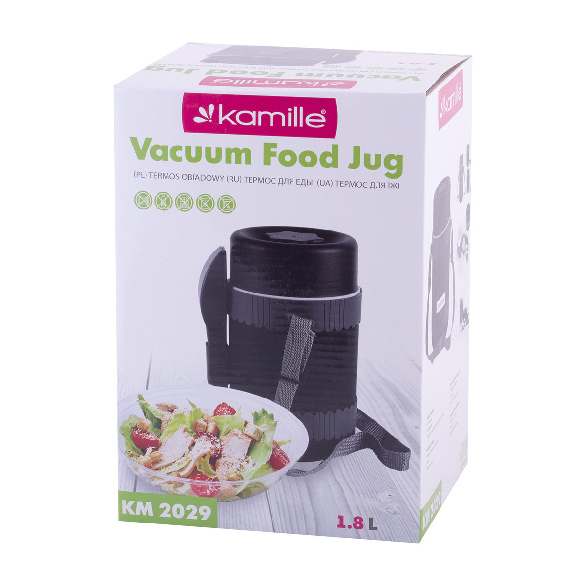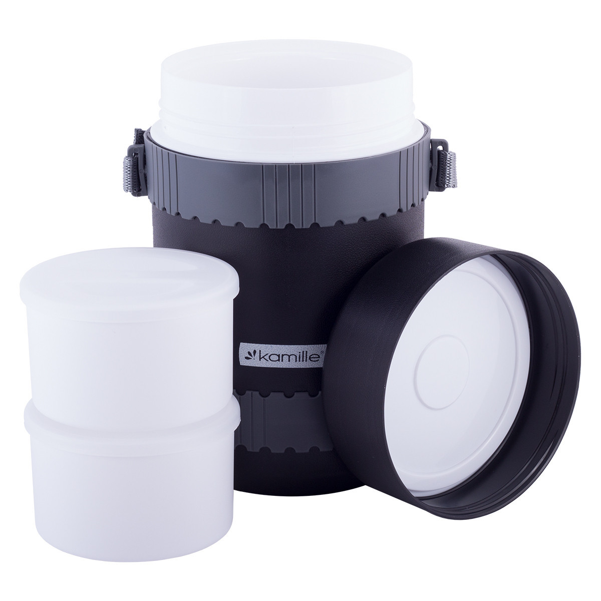 Термос пищевой обеденный для супа kamille 1800мл пластиковый km-2029. Бренд: Kamille Описание: Термос пищевой Kamille обладает высоким качеством, надежностью, компактными размерами и эстетичным, актуальным, дизайном. Горячее остается горячим, а холодное — холодным. Термос пищевой Kamille станет незаменимым в машине, на отдыхе или в путешествии. Тип термоса: пищевой Материал корпуса, колбы, крышки и ёмкостей: полипропилен. Высота: 23см. Диаметр: 13,5см. Количество ёмкостей: 3 (с крышками). Общий объем: 1800мл. Наличие ложки и вилки: да. Поверхность: матовая. Время сохранения температуры: 6-8 часов. Дополнение: полиэстеровый ремешок с регулируемой длиной. Упаковка: картонная коробка 16,5*14,5*24см. Особенности: матовая поверхность высокопрочная конструкция сохраняет тепло/холод 6-8 часов 100% герметичен