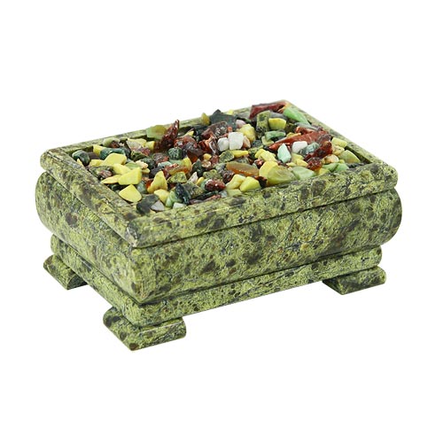 Шкатулка "каменная россыпь" змеевик. Вес 500 г Размер 12x7x6 см Материал змеевик, яшма, офиокальцит и другие уральские самоцветы  развернуть описание ▼