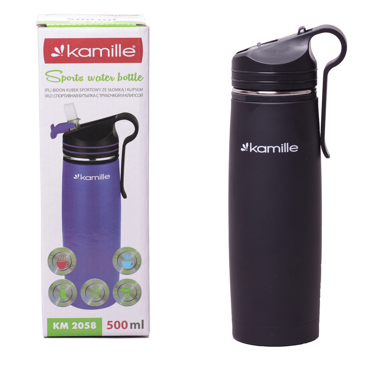 Спортивный термос-бутылка kamille черный 500мл из нержавеющей стали с труб. Бренд: Kamille Описание: Термос-бутылка Kamille обладает высоким качеством, надежностью, компактными размерами и эстетичным дизайном. Такая спортивная бутылка станет незаменимой всем любителям путешествий, активного отдыха и занятий спортом. Тип термоса: питьевой Материал корпуса: нержавеющая сталь Материал колбы: нержавеющая сталь Материал крышки: пластик Объем: 500мл Поверхность: матовая Время сохранения температуры: 6-8 часов Варианты цветов: черный, голубой, серый, фиолетовый Особенности: эксклюзивный дизайн высокопрочная конструкция удобная и прочная крышка с трубочкой-поилкой оснащен специальной клипсой для крепления 100% герметичен
