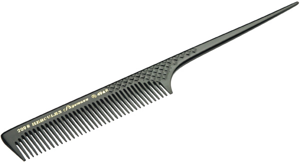 Расчёскас пластиковым хвостиком. Расчёска с пластиковым хвостиком редкозубчатая, длина - 20,3 см. Расчёски Hercules отличаются прочностью, надёжностью и прекрасными антистатическими свойствами, так как изготавливаются из эбонита, получаемого из высококачественного каучука. На финальной стадии изготовления расчёсок внутренняя сторона зубчиков проходит специальную обработку, в результате которой они становятся гладкими и не повреждают волосы при расчёсывании. Страна происхождения: Германия Артикул: 209 R8 Бренд: HERCULES Тип расчески: С хвостиком Длина расчески: 20 - 21 см Материал расчески: Каучук