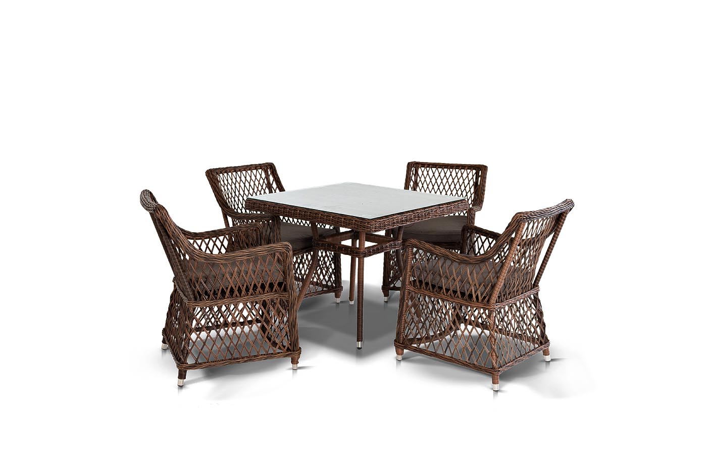 Айриш, обеденная группа, коричневая. Обеденная группа из искусственного ротанга: 1 квадратный обеденный стол со стеклянной столешницей, 4 кресла. Алюминиевый каркас, круглый искусственный ротанг коричневого оттенка, ручное плетение. Кресла оснащены подушками со съемными чехлами. Материал каркаса Искусственный ротанг, алюминий Материал подушки полиэстер 100% плотностью 230гр/м2 с влагоотталкивающей пропиткой Вес 44кг