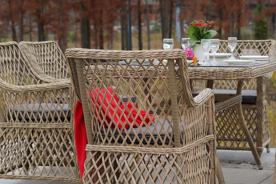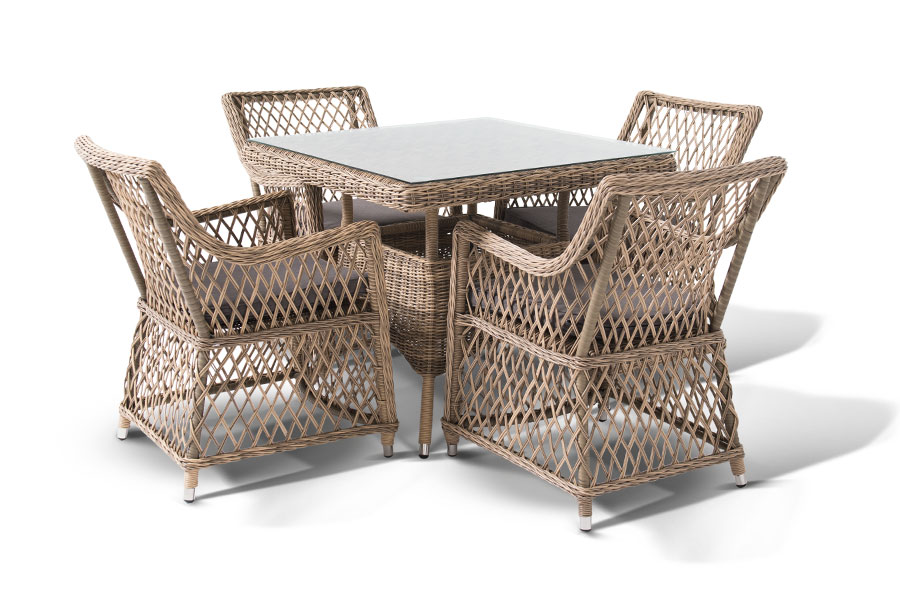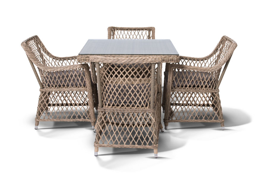 Айриш, обеденная группа, соломенная. Обеденная группа из искусственного ротанга: 1 квадратный обеденный стол со стеклянной столешницей, 4 кресла. Алюминиевый каркас, круглый искусственный ротанг соломеннего оттенка, ручное плетение. Кресла оснащены подушками со съемными чехлами. Материал каркаса Искусственный ротанг, алюминий Материал подушки полиэстер 100% плотностью 230гр/м2 с влагоотталкивающей пропиткой Вес 44кг