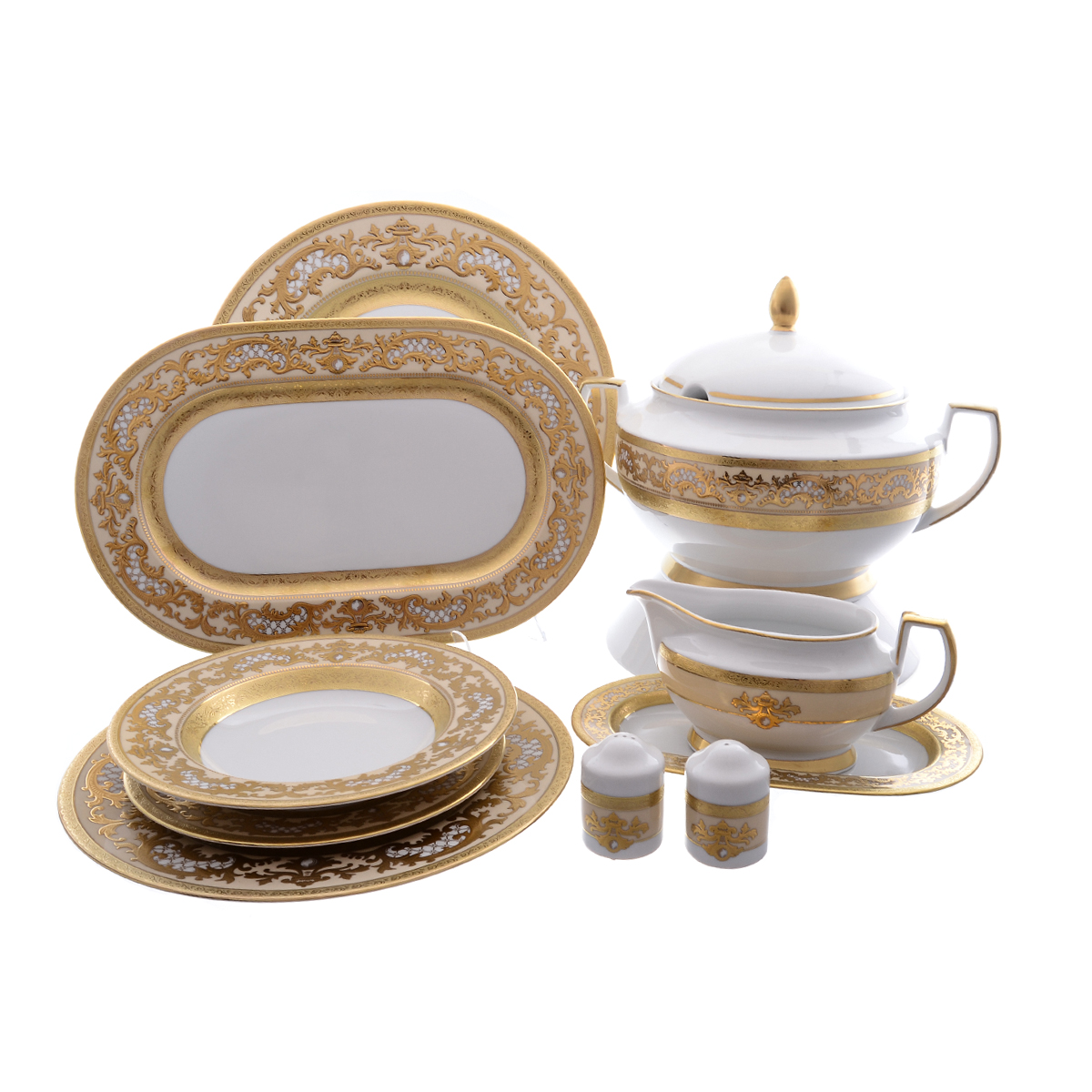 Столовый сервиз на 6 персон falkenporzellan alena 3d creme gold constanza . Столовый сервиз на 6 персон Falkenporzellan Alena 3D Creme Gold Шикарный сервиз! Наш красавец! С его появлением на кухне автоматически поднимается настроение. Довольно нежное сочетание кремового оттенка фарфора с золотом. Уже сегодня он может стать достойным украшением вашего стола: уютный ужин в кругу семьи или оживленный прием по поводу торжества – на любой случай. Состав набора: 1) Овальное блюдо 36 см - 1 шт. 2) Круглое глубокое блюдо 31 см - 1 шт. 3)Салатник 23 см круглый - 1 шт. 4) Тарелка десертная 19 см - 6 шт 5) Тарелка суповая 23 см - 6 шт, 6) Тарелка подстановочная 25 см - 6 шт, 7) Соусник +подставка 0,5 л - 1 шт. 9) Прибор для специй - 2 шт, 10) Супница+крышка- 1 шт ,объем 3 л.  развернуть описание ▼