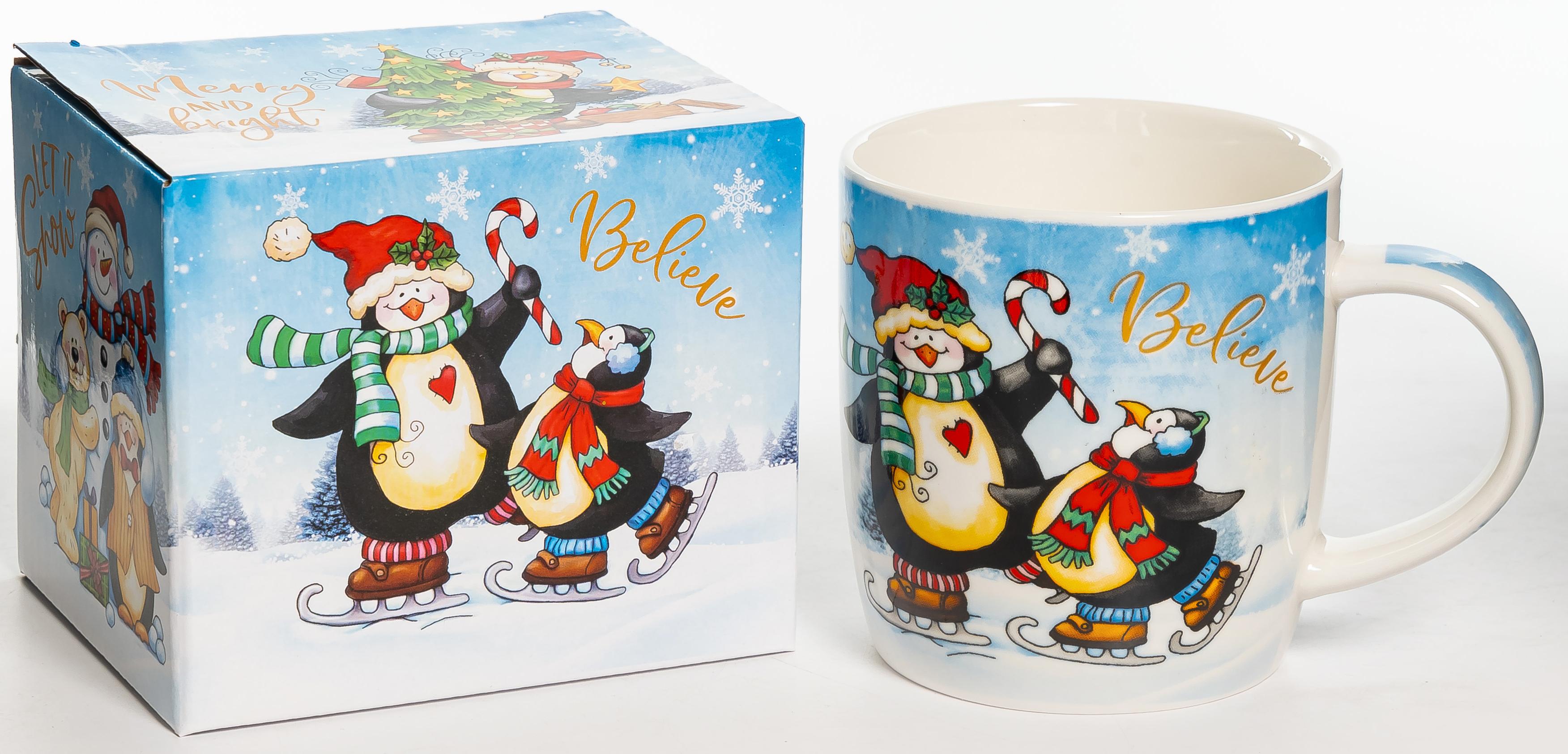 Пингвины, кружка 380мл, микс 4 декора, New Bone China, индивидуальная подарочная упаковка