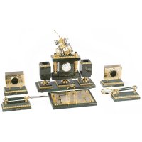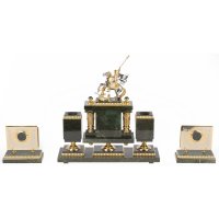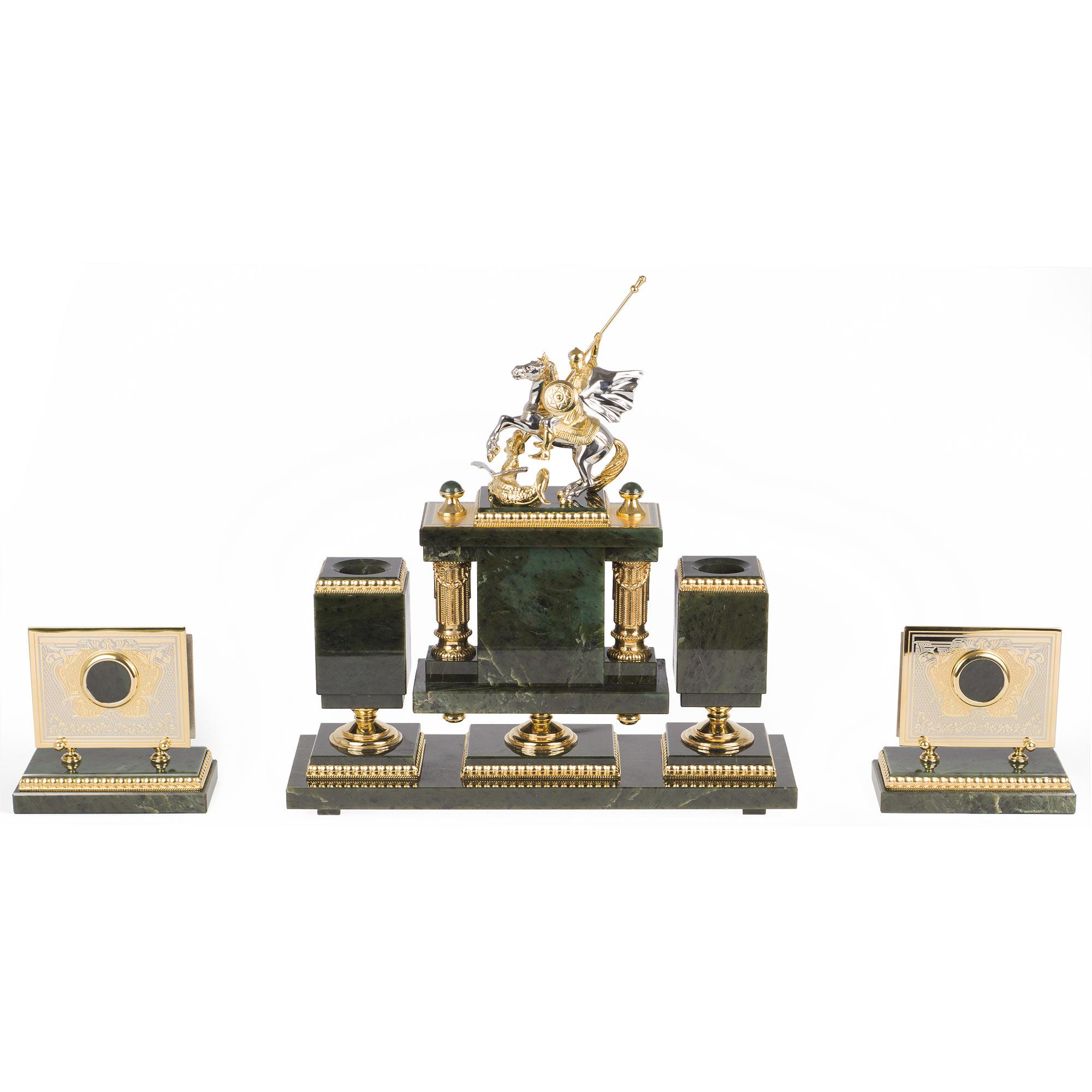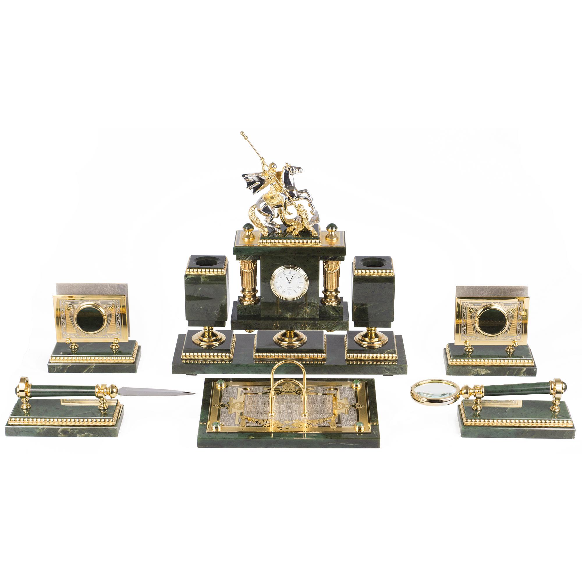 Настольный набор георгий победоносец нефрит позолота. Вес 22000 г Размер часы 38х9х31 см, визитница 12,5х6х11 см, календарница 26х18х3 см, нож 24х3х2 см, лупа 20х7х2 см Материал нефрит, бронза, никель, покрытие золотом (999,9). Месторождение Миасское, Челябинская область, Россия  развернуть описание ▼