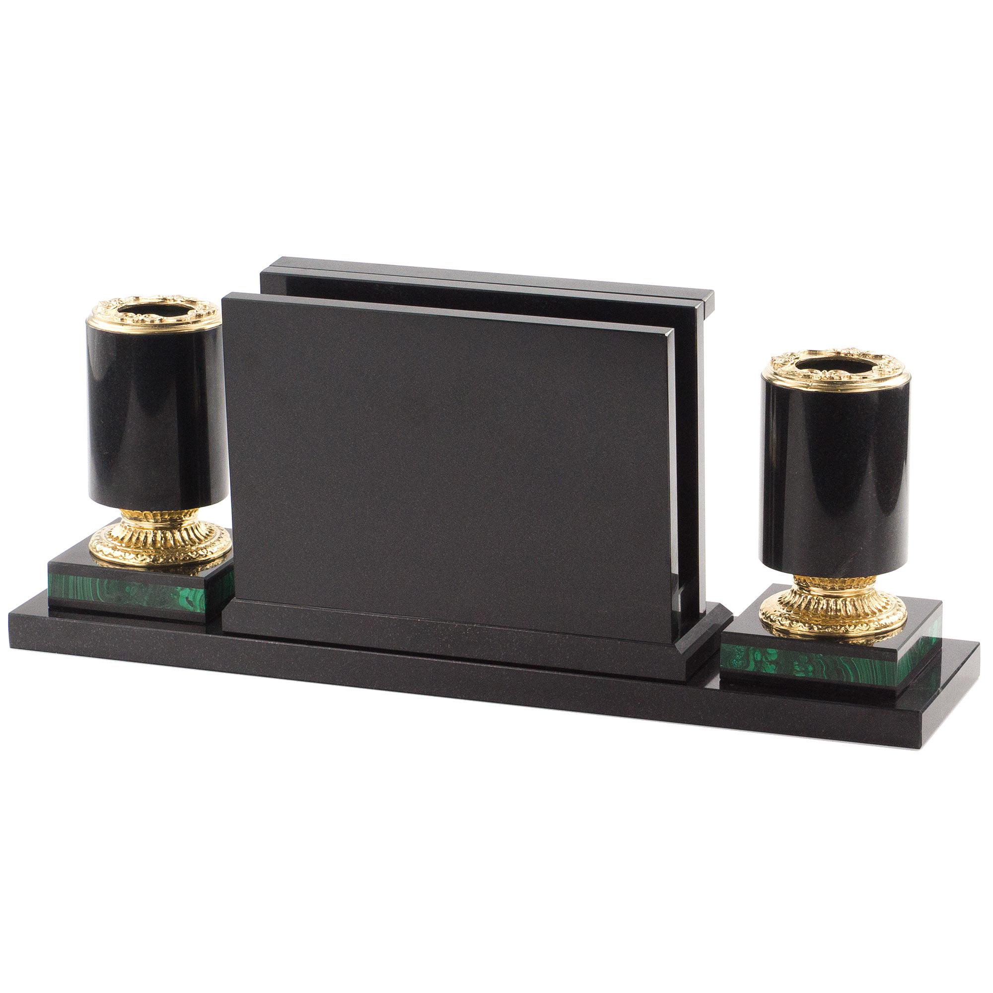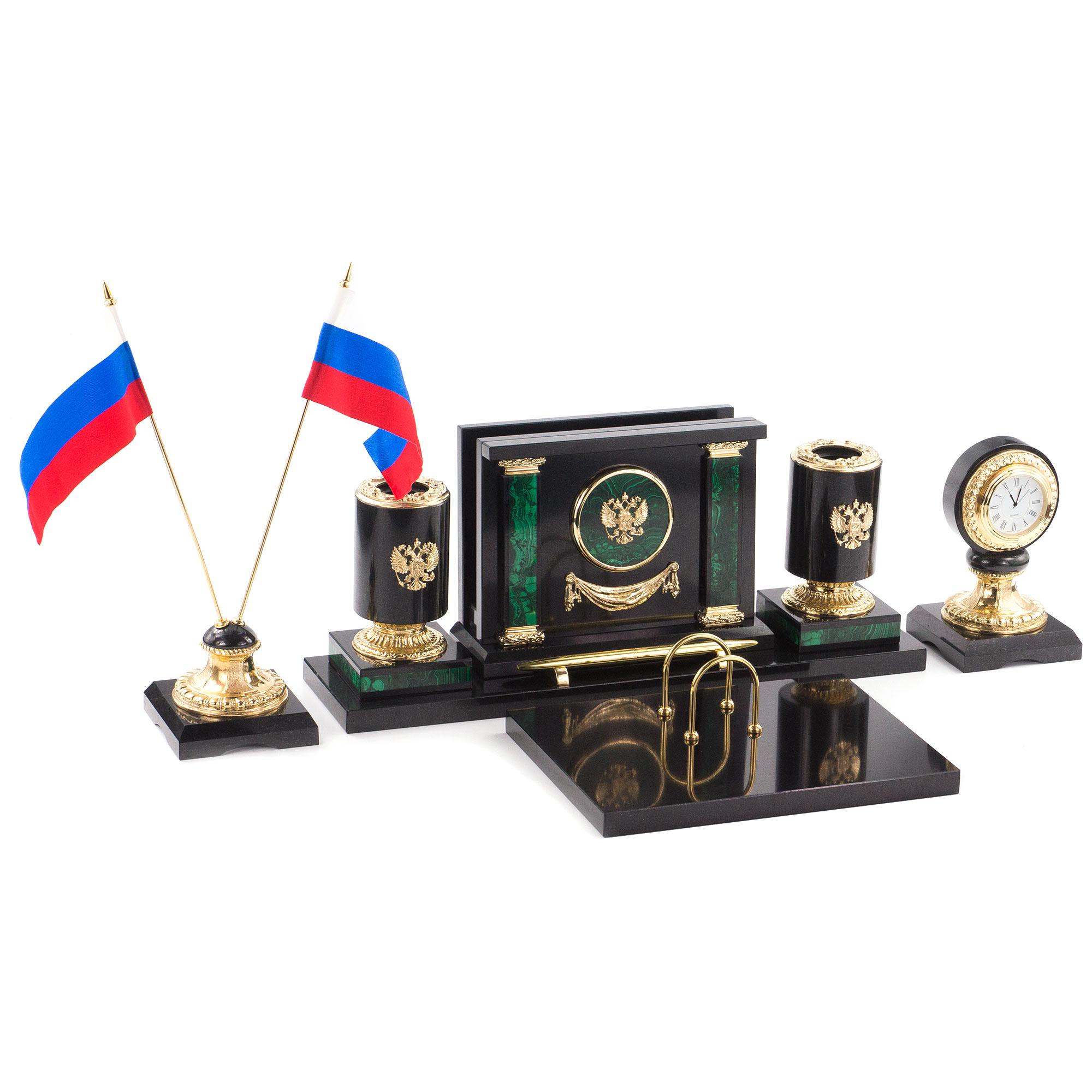 Настольный набор герб малахит 415х105х170. Вес 15 кг Размер центр 41,5х10,5х17 см, календарница 24х18х1,5 см, часы 9х9х15 см, подставка с флагами 9х9х32,5 см. Материал малахит, долерит, бронза.  развернуть описание ▼