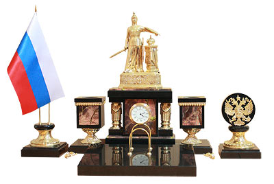 Настольный набор россия камень яшма, бронза арт.3452. Вес 15000 г Размер часы 54х30х36 см, календарница 24х18х1,5, герб 9х9х15, подставка с флагами 9х9х32,5 см Материал яшма, бронза, долерит  развернуть описание ▼