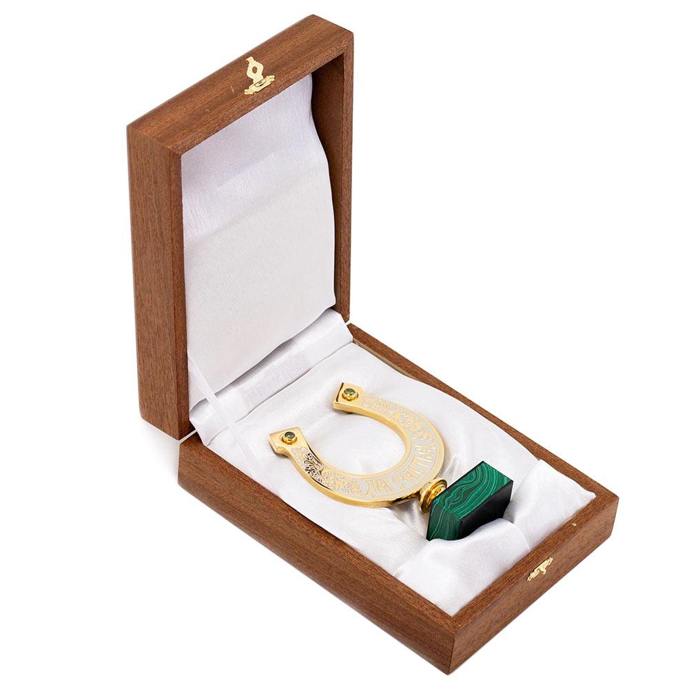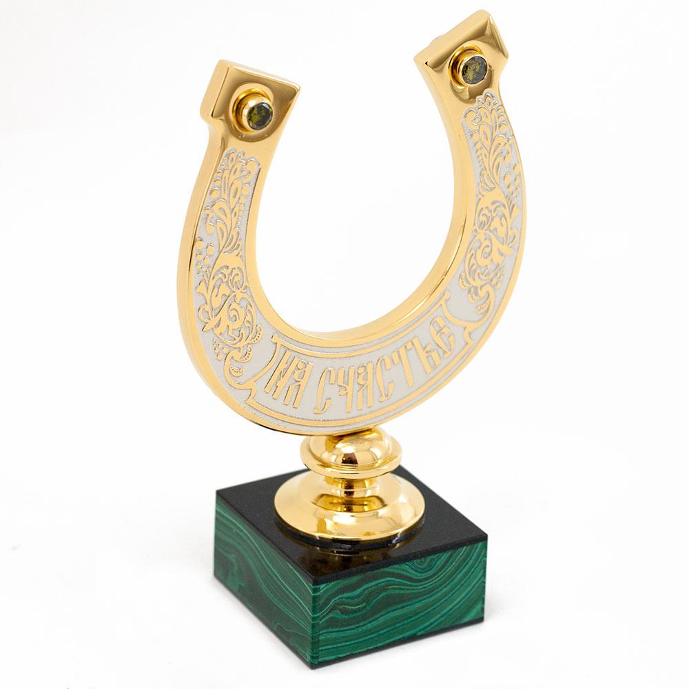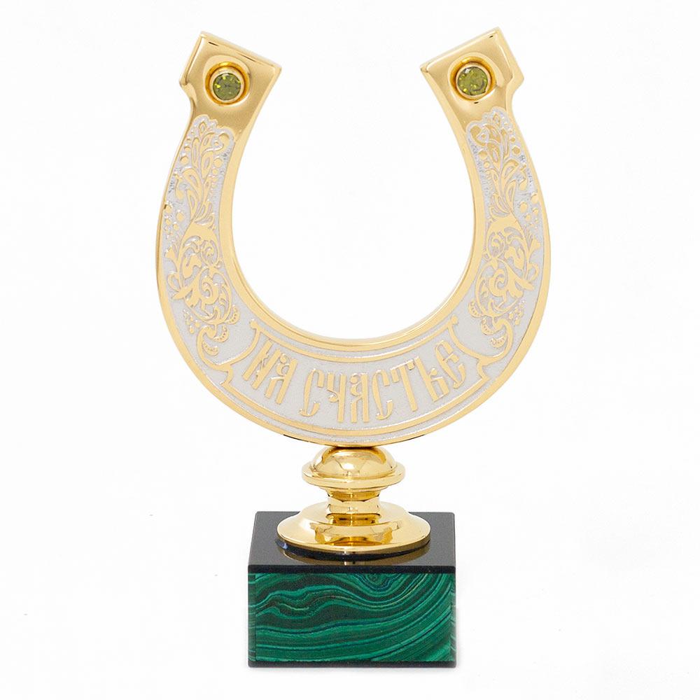 Подкова "на счастье" камень малахит. Вес 750 г Размер 8х4х12 см Материал малахит, долерит, фианиты, латунь, никель, покрытие золотом (999,9).  развернуть описание ▼