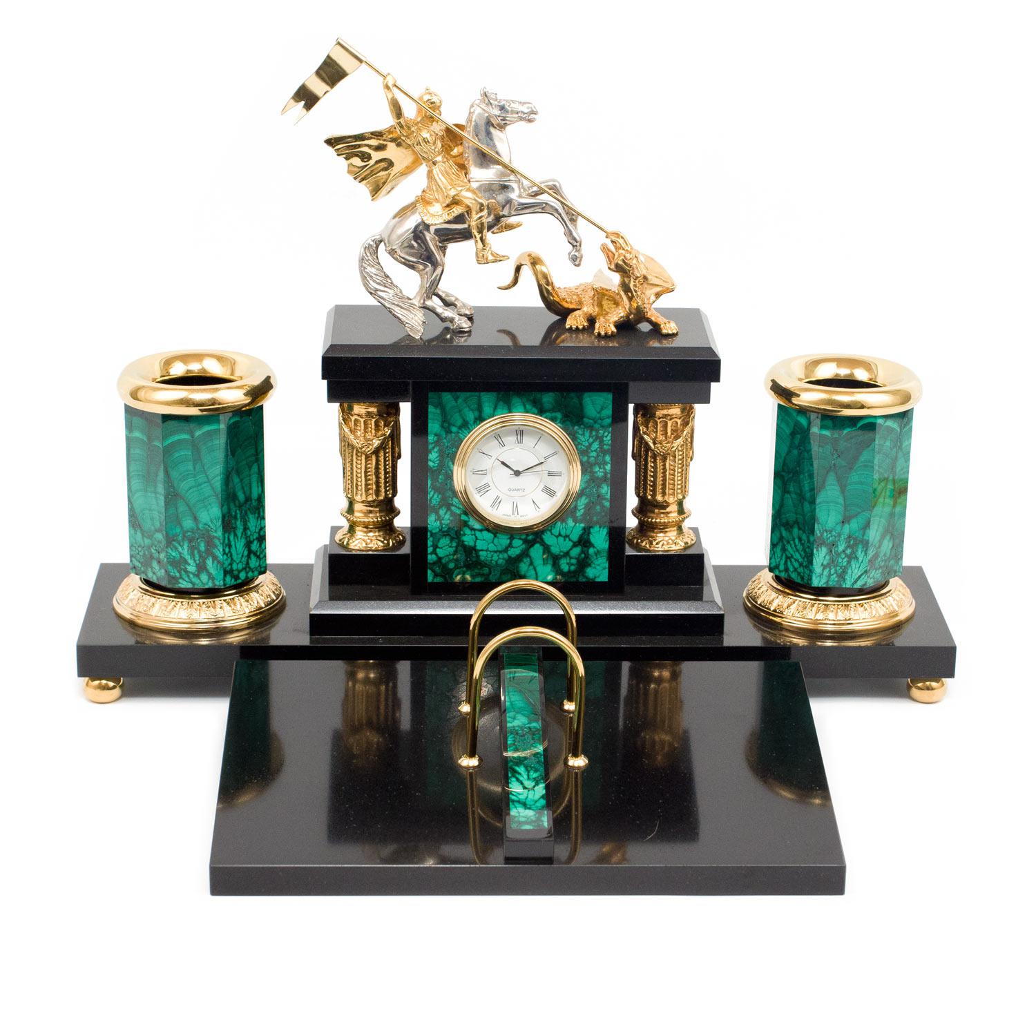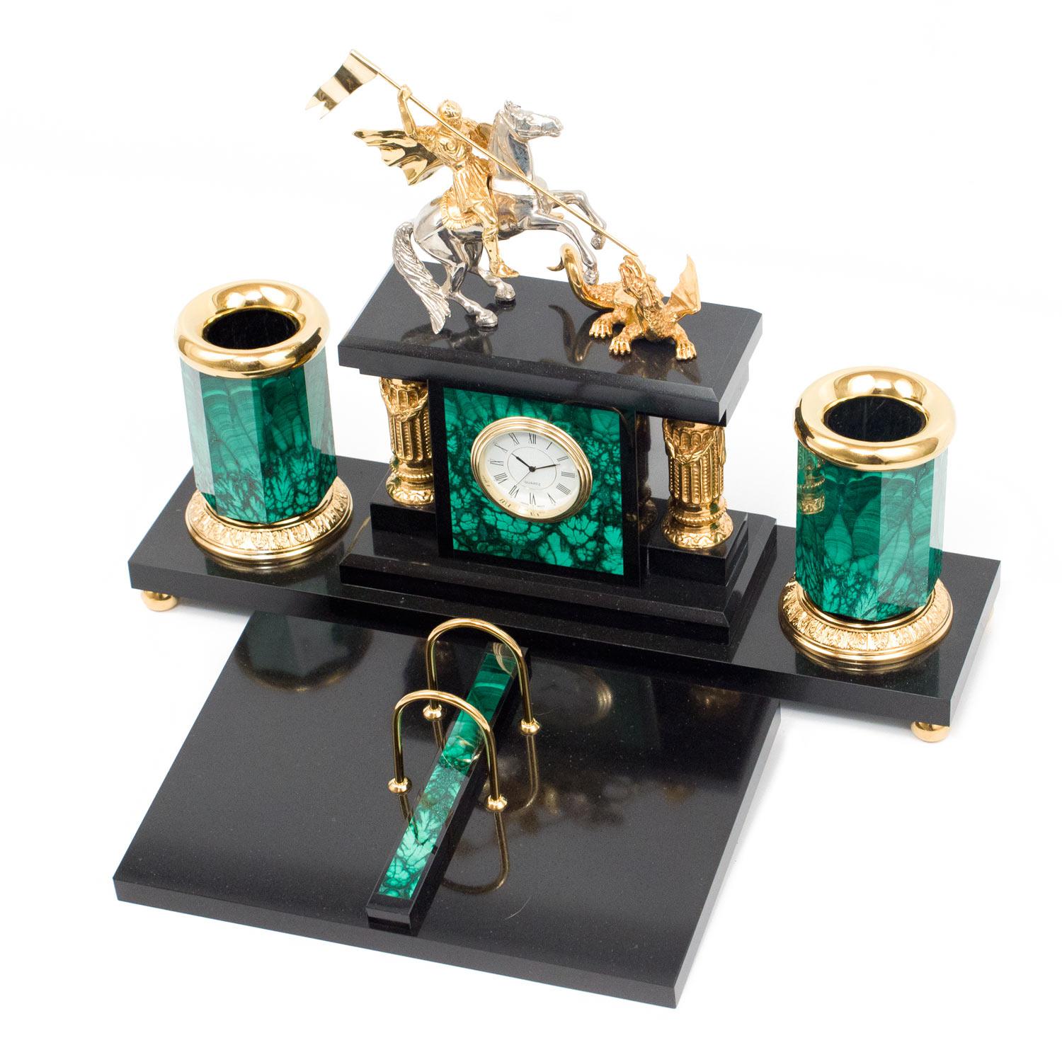 Настольный набор "георгий победоносец" малахит позолота . Вес 11 кг Размер часы 38х27х28 см, подставка под календарь 26х18х3 см. Материал малахит, долерит, бронза, никель, покрытие золотом (999,9).  развернуть описание ▼