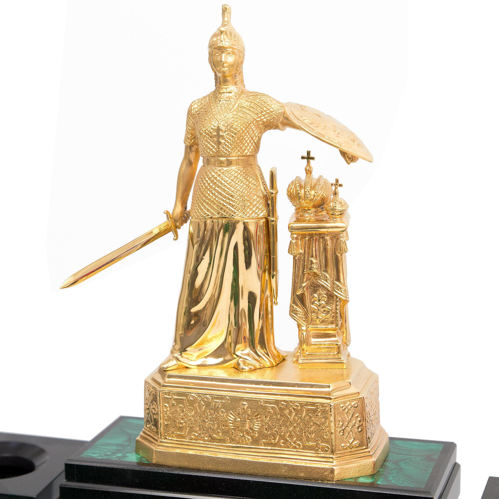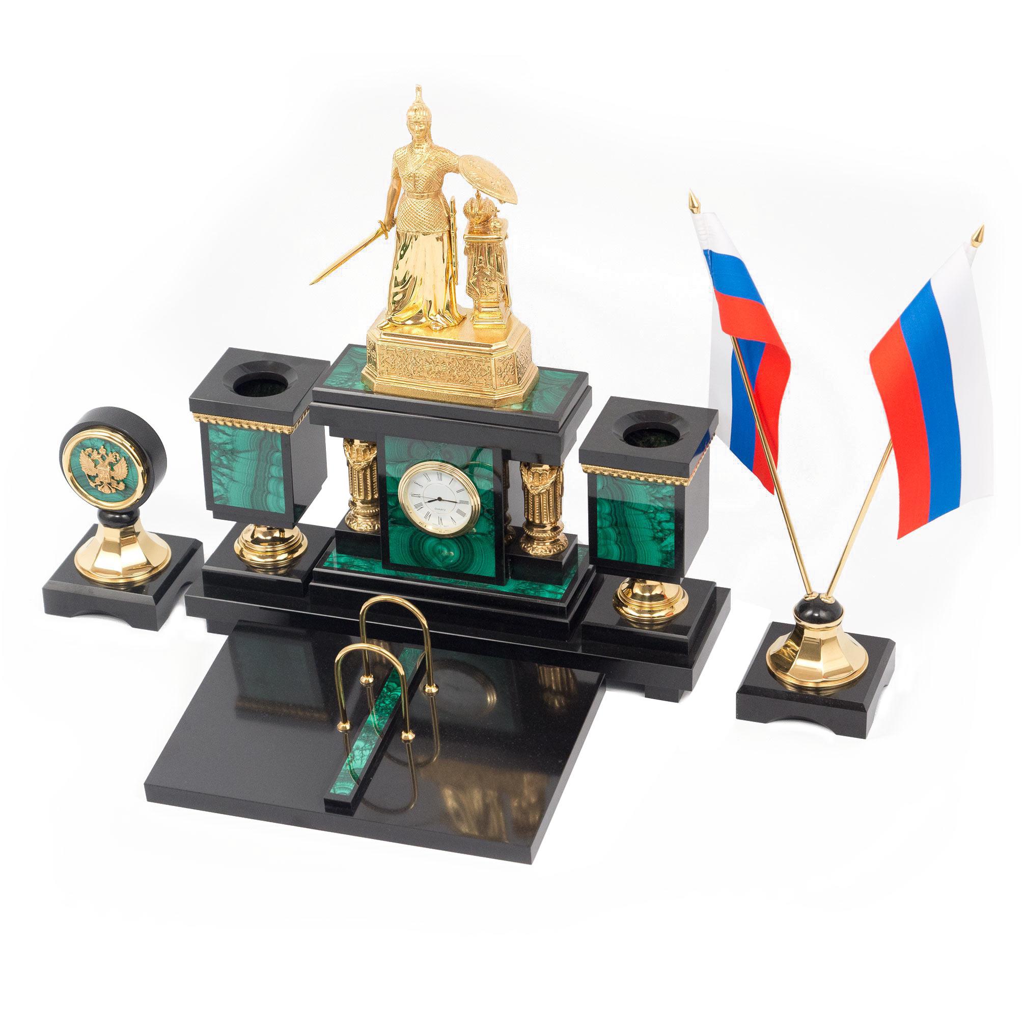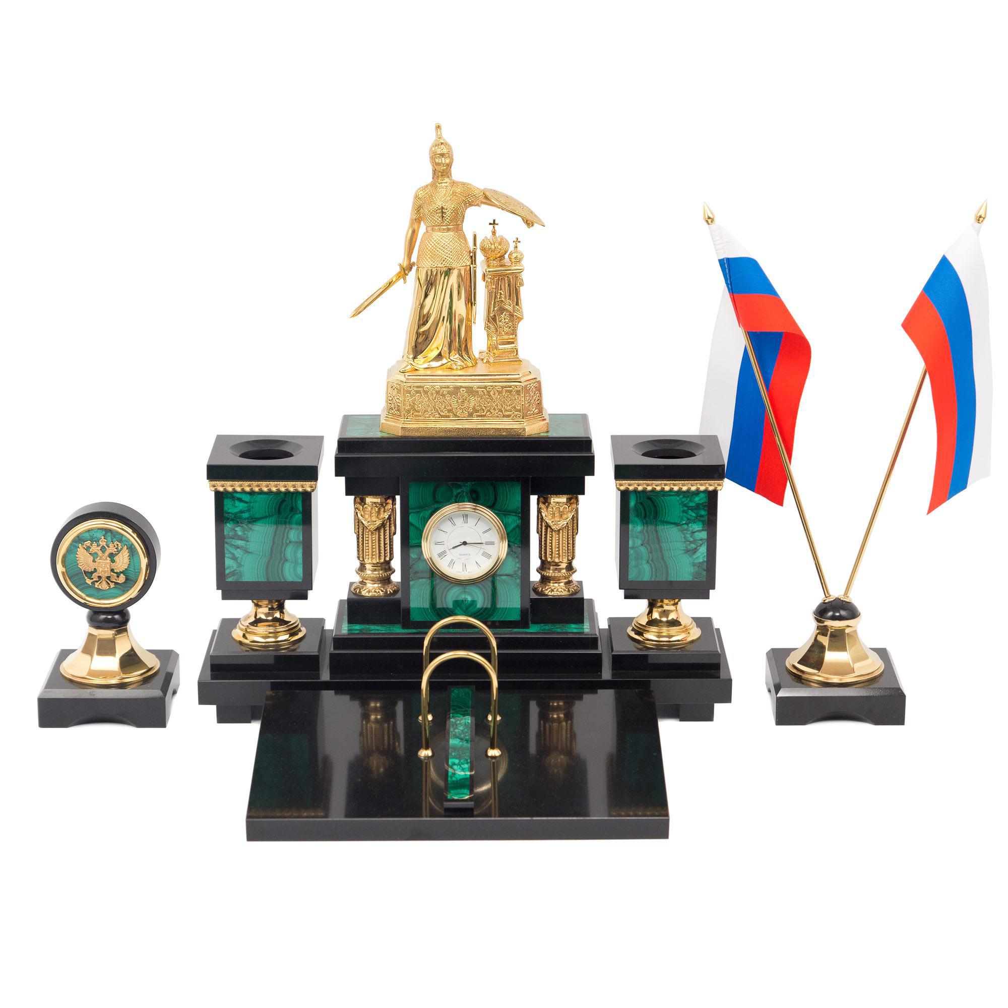 Настольный набор "россия" малахит бронза позолота . Вес 18 кг Размер часы 50х26х38 см, подставка под календарь 26х18х3 см. Материал малахит, долерит, бронза, никель, покрытие золотом (999,9).  развернуть описание ▼