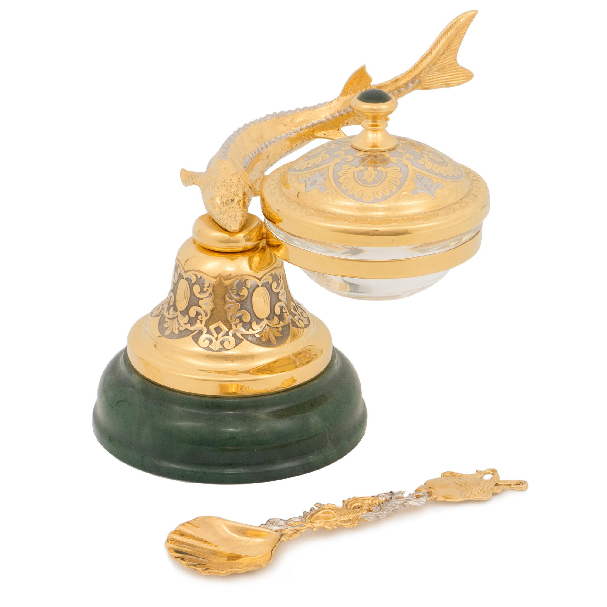 Икорница "колокольчик" нефрит позолота. Вес 2150 г Размер 13,5х13х13 см Материал нефрит, бронза, стекло, никель, покрытие золотом (999,9). Месторождение Миасское, Челябинская область, Россия  развернуть описание ▼