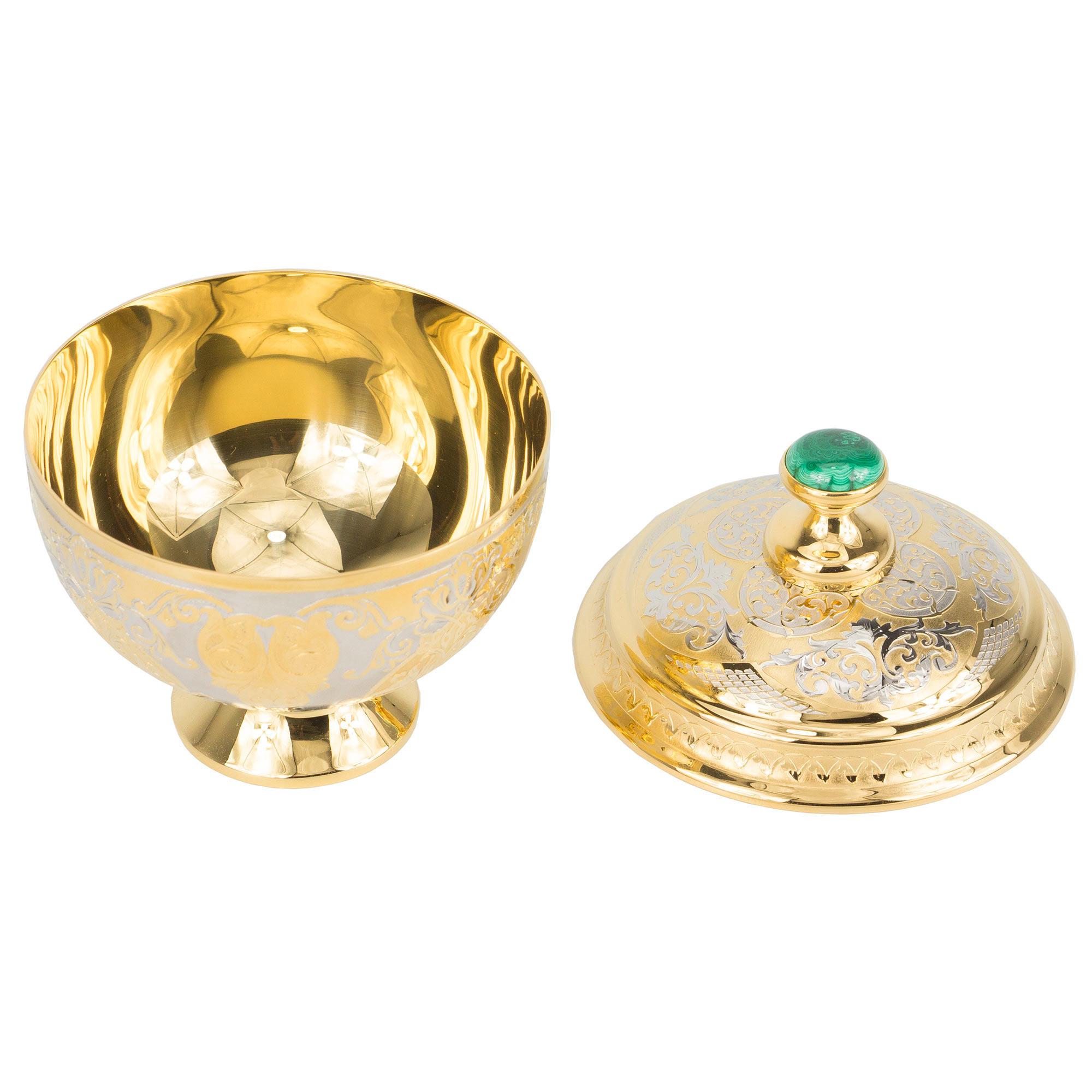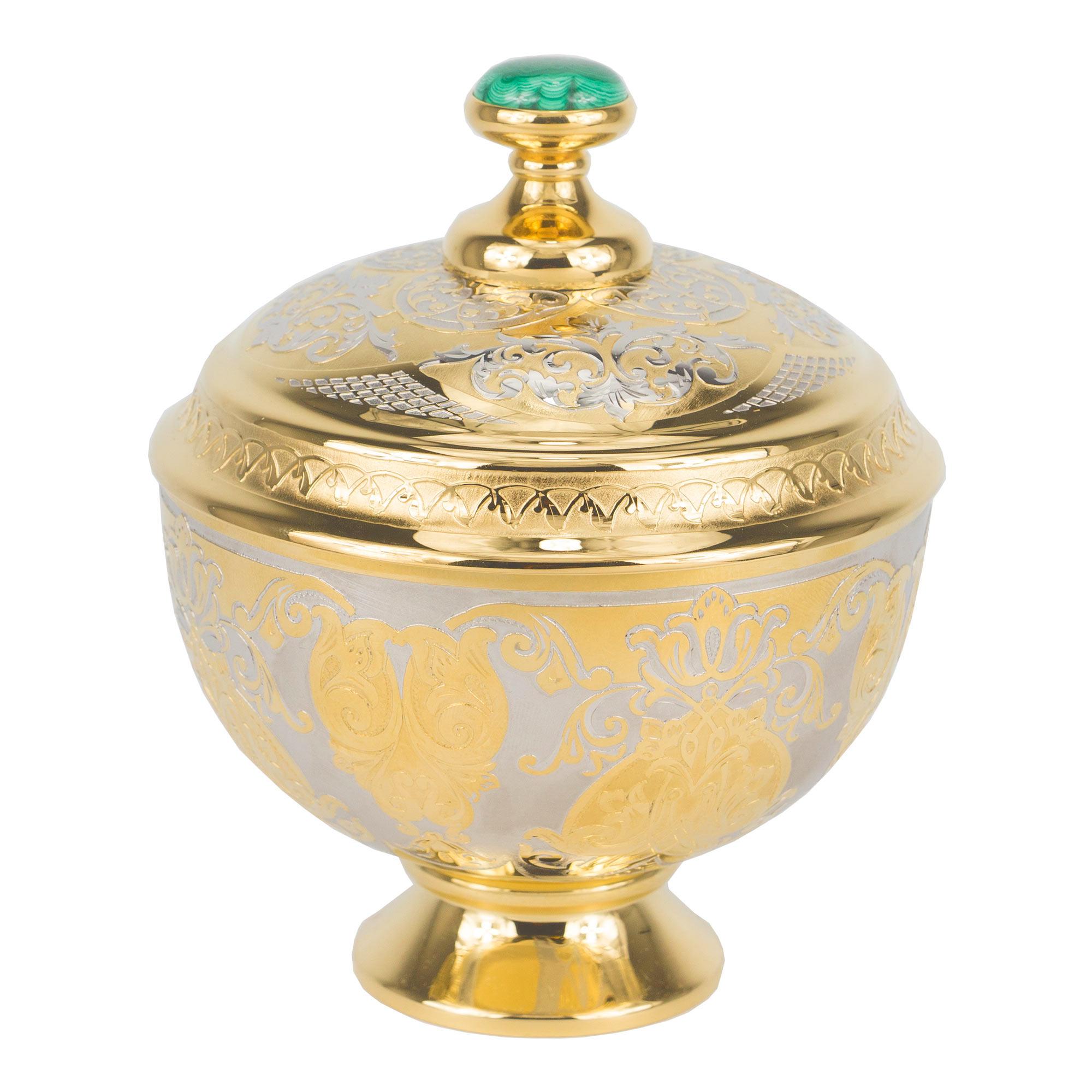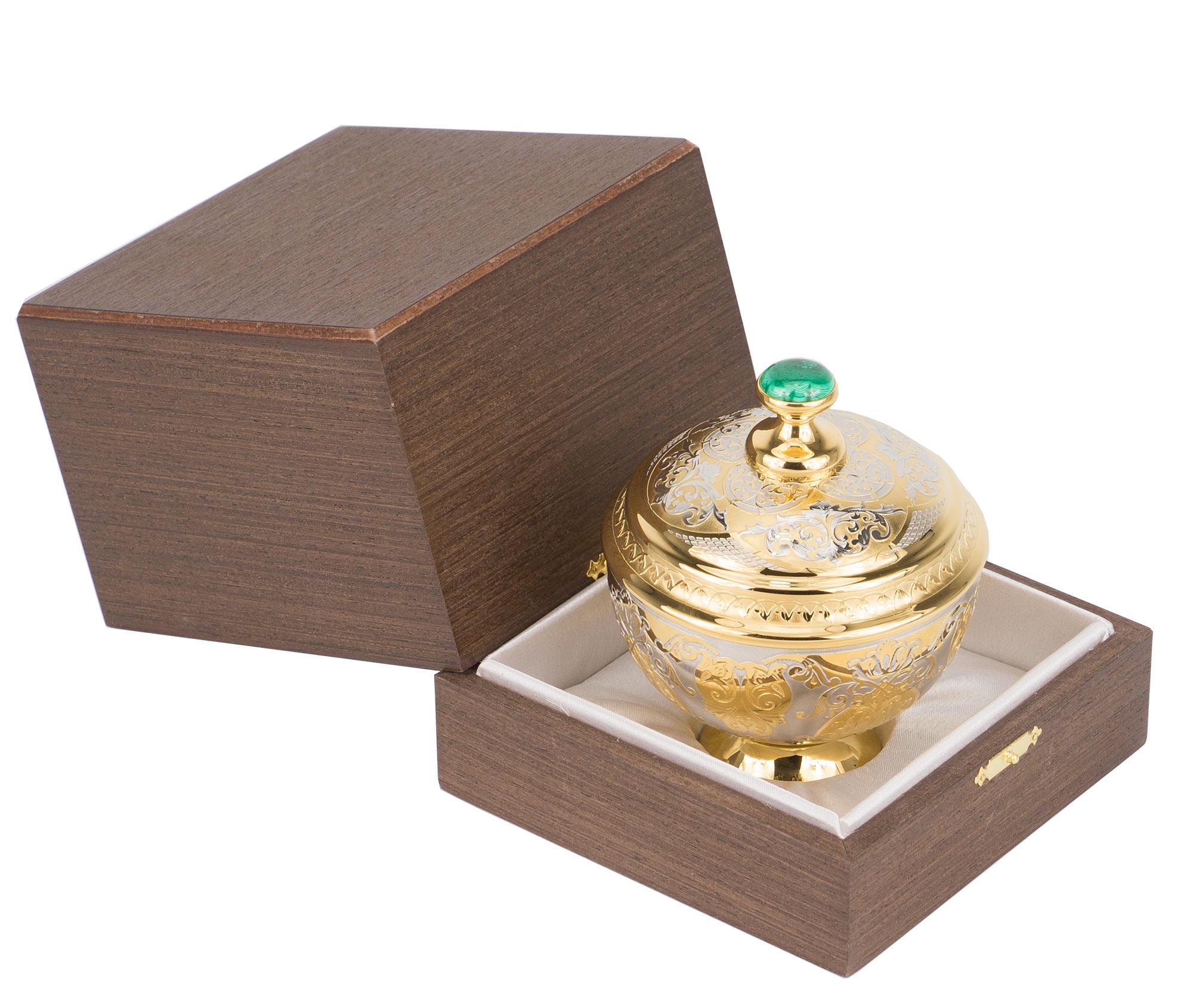 Сахарница малахит позолота 110х110х135 мм 1500 гр.. Вес 1500 г Размер 11х11х13,5 см Материал малахит, латунь, никель, покрытие золотом (999,9).  развернуть описание ▼